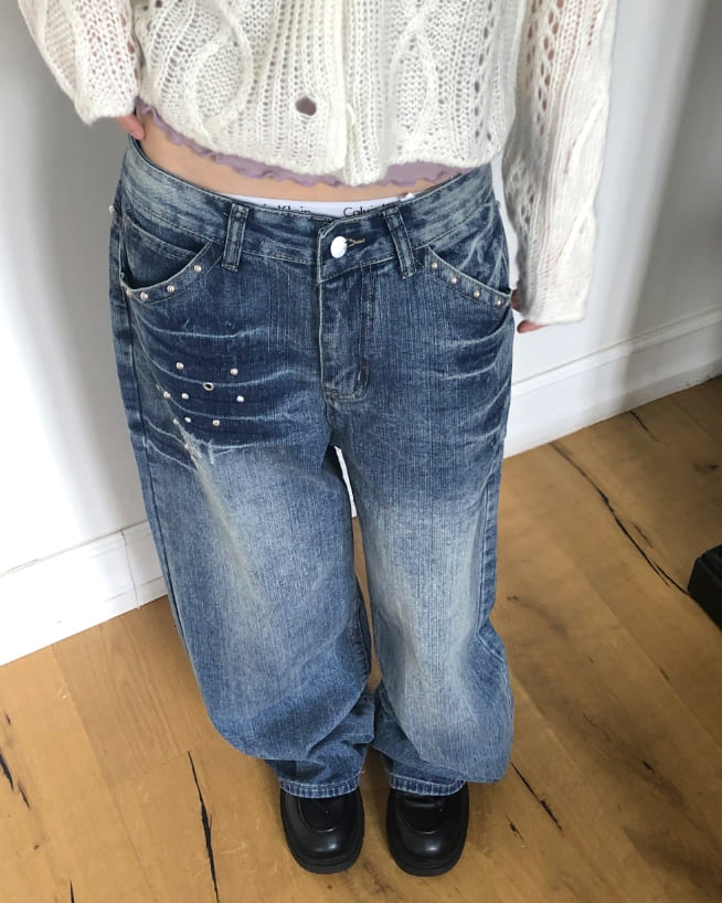 ボアスタッドアイレットポケットワイドフィットウォッシングデニムロングパンツ