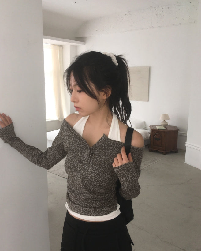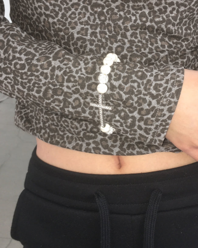 ブリックレオパードホピシャーリングボタンTシャツ