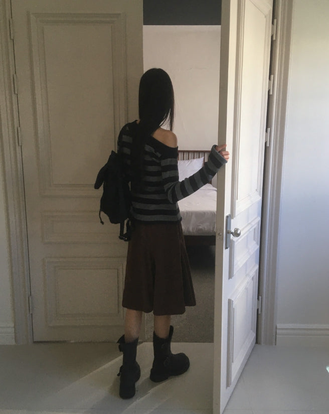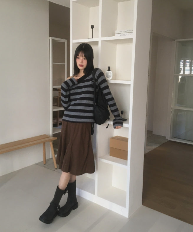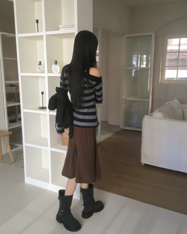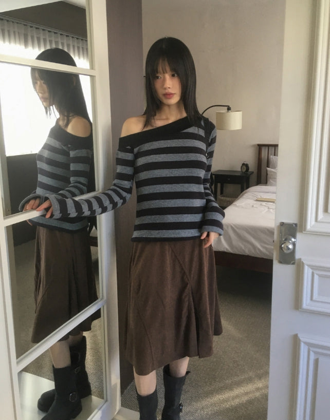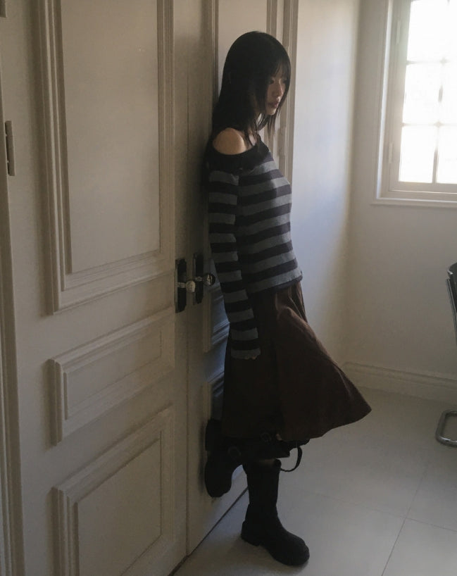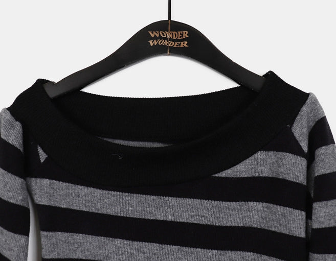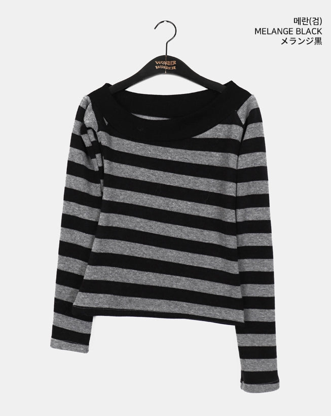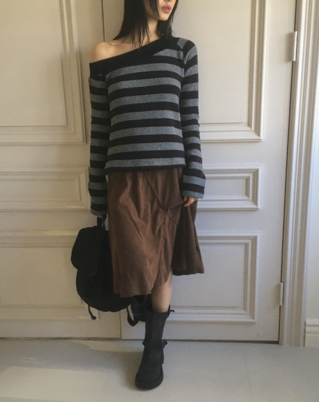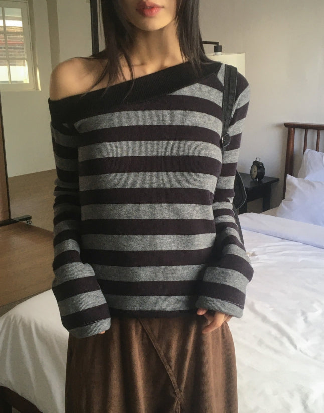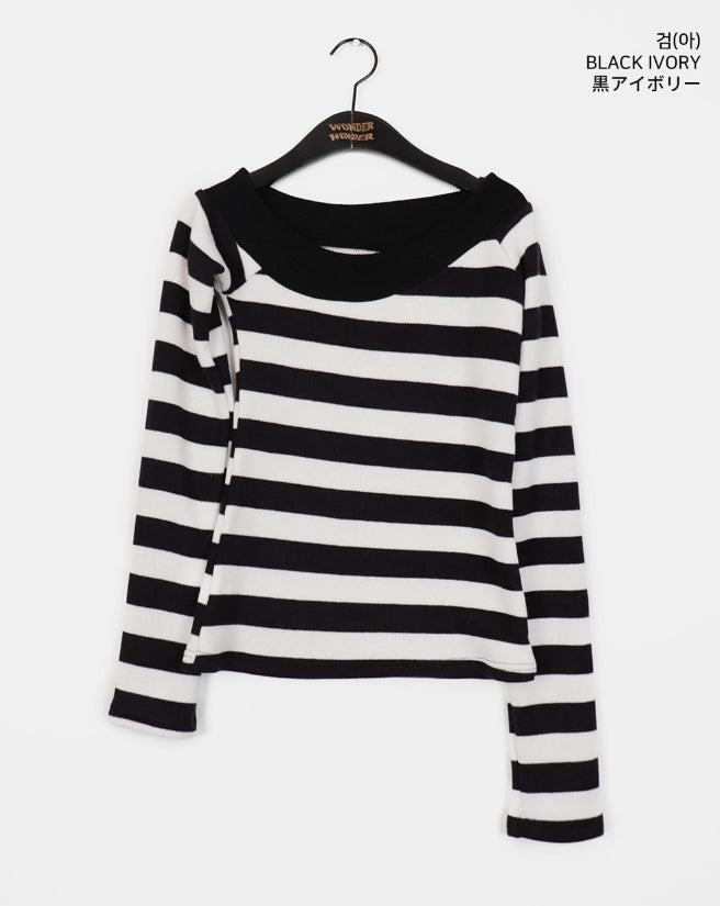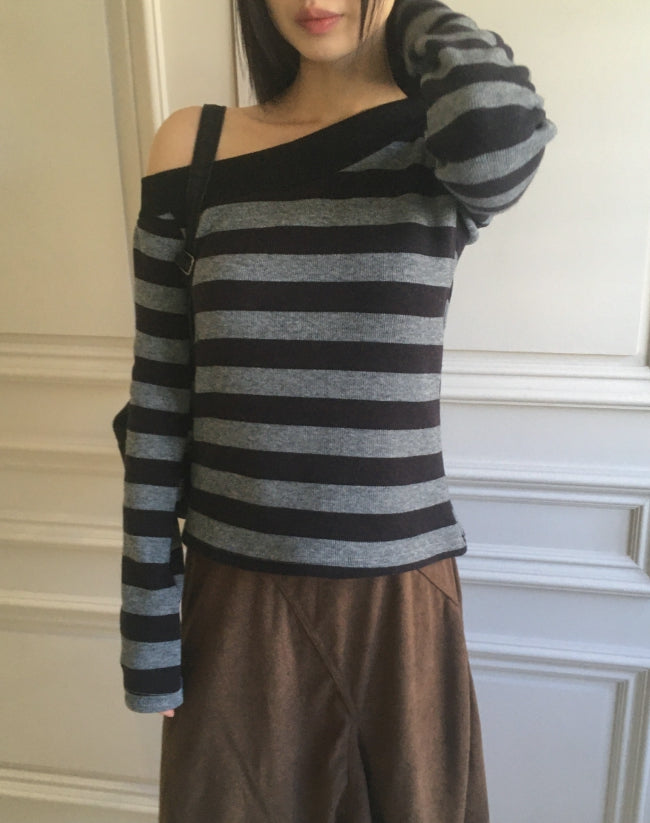 [Brushed Lining] Knockin Stripe One Shoulder Unbalanced Knit T-shirt