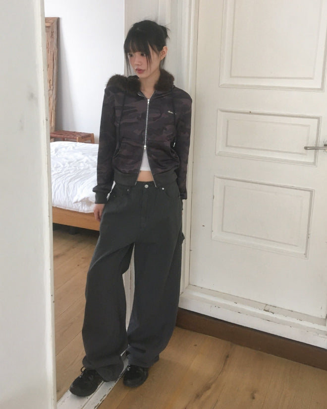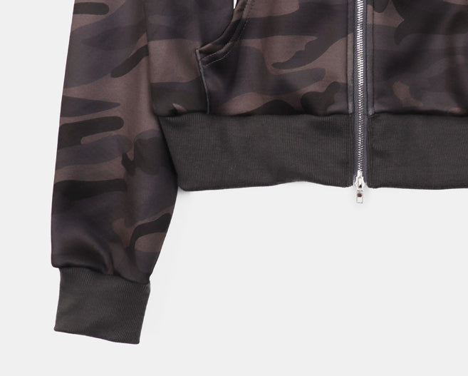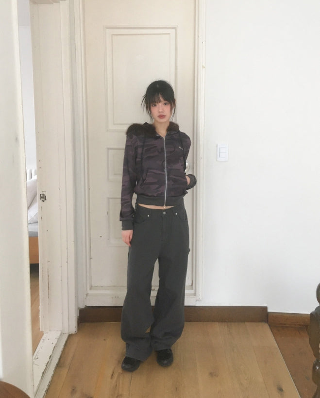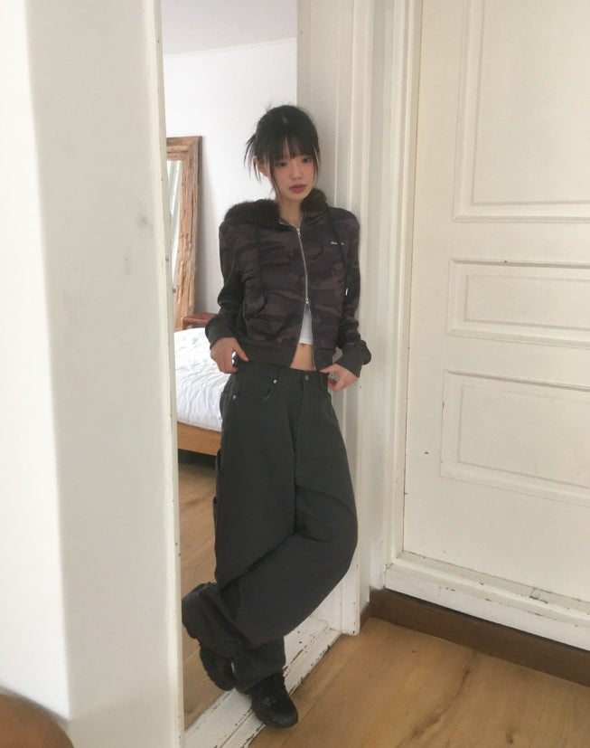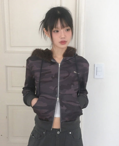 [Fleece Lining] Racquel Camo Military Fur Two-Way Hooded Zip-Up