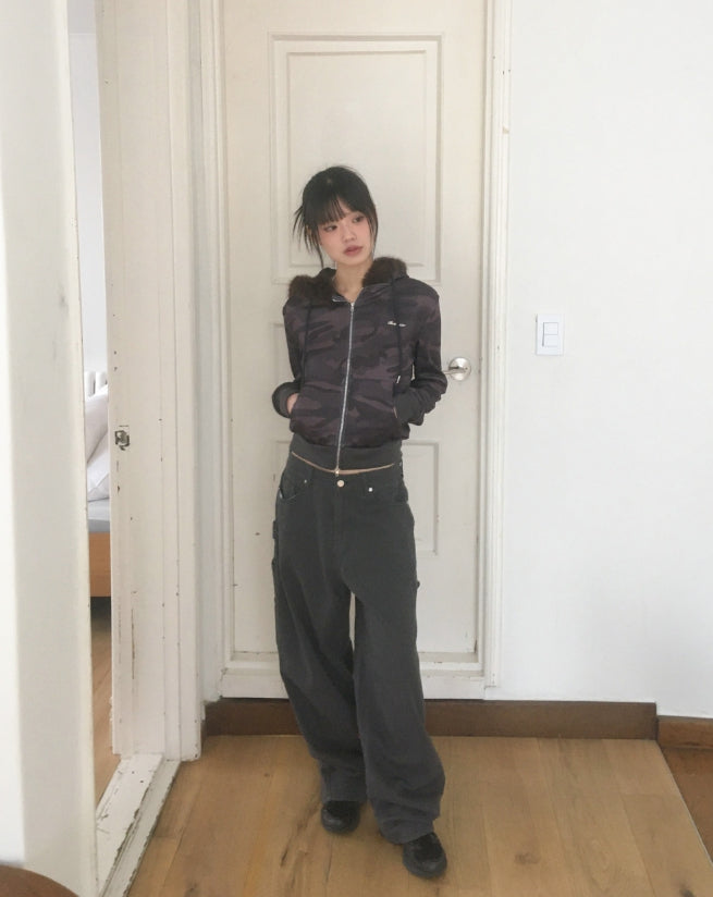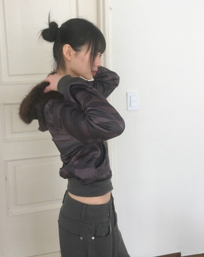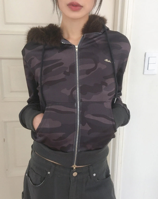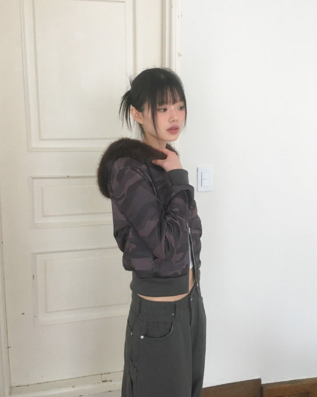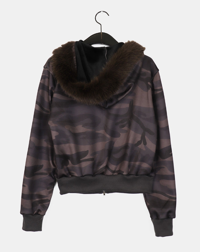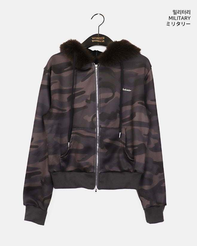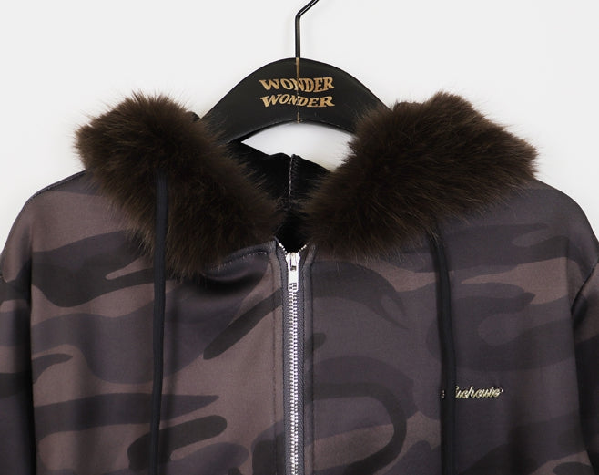 [Brushed Lining] Racquel Camo Military Fur Two-Way Hood Zip-Up