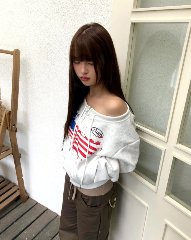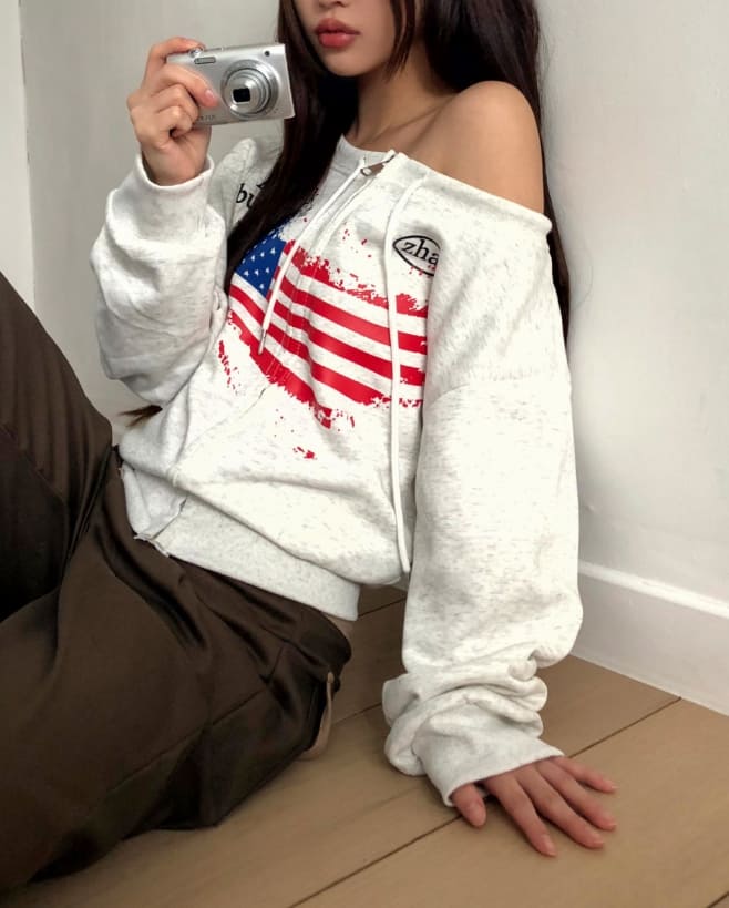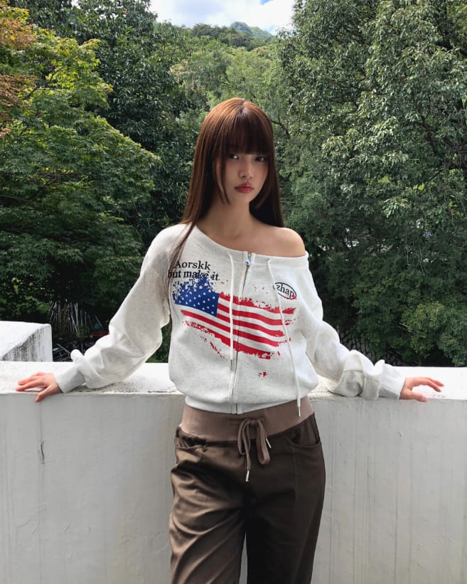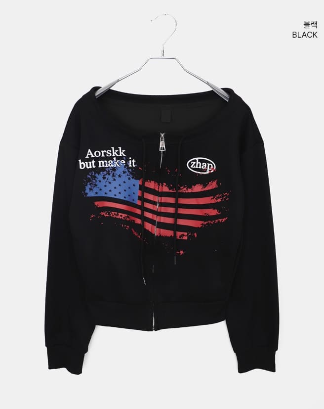Burnoon American Flag Strap One Off Shoulder Long Sleeve Zip-up