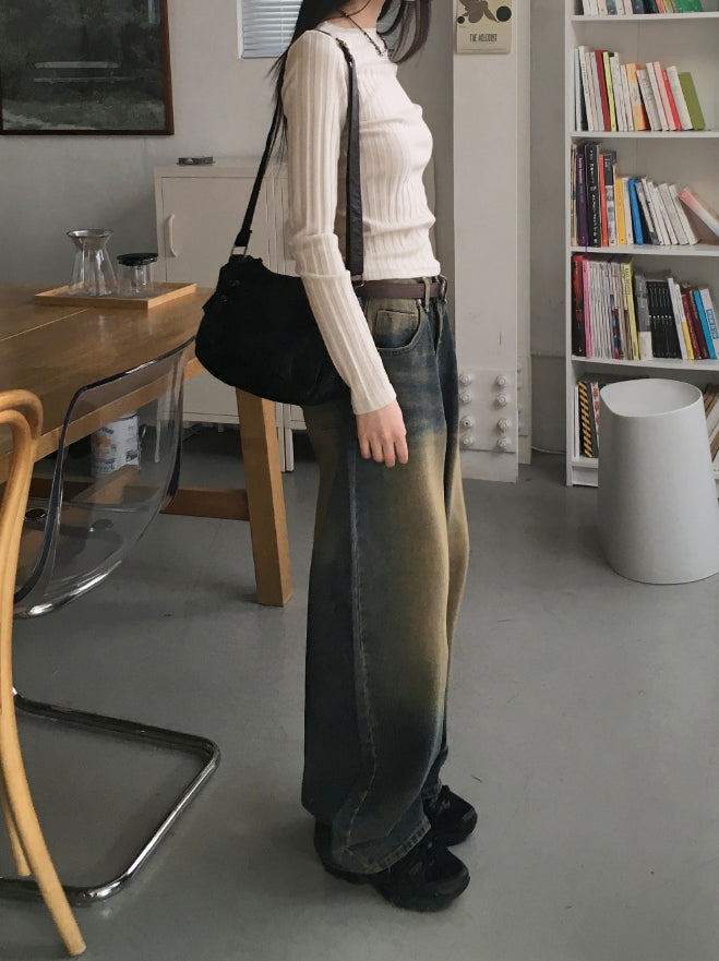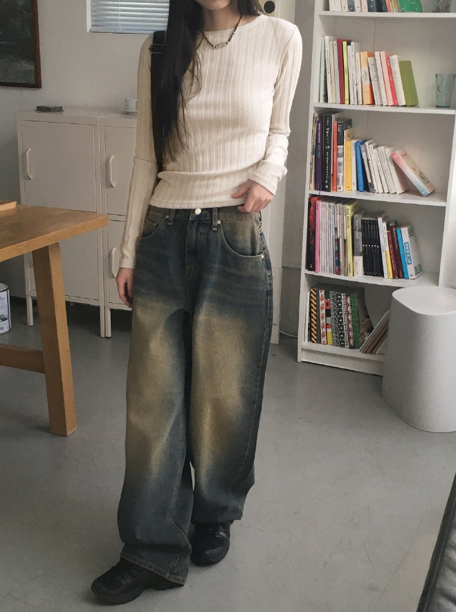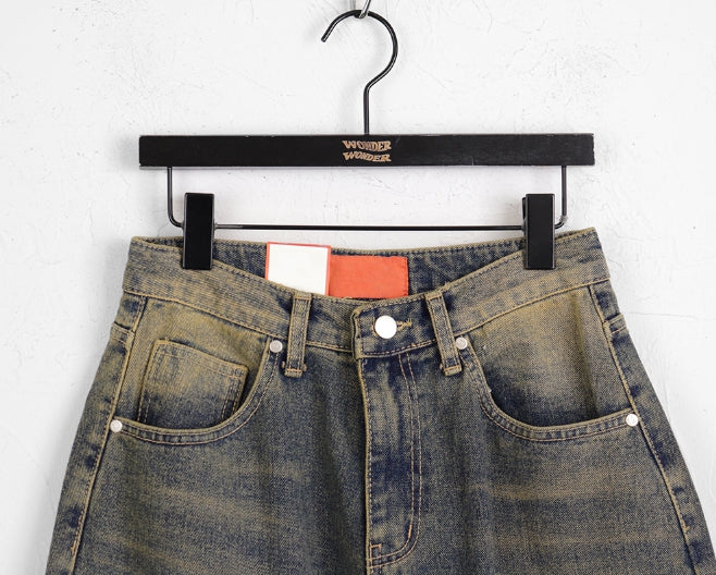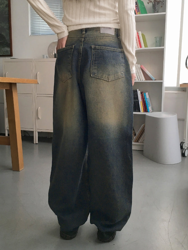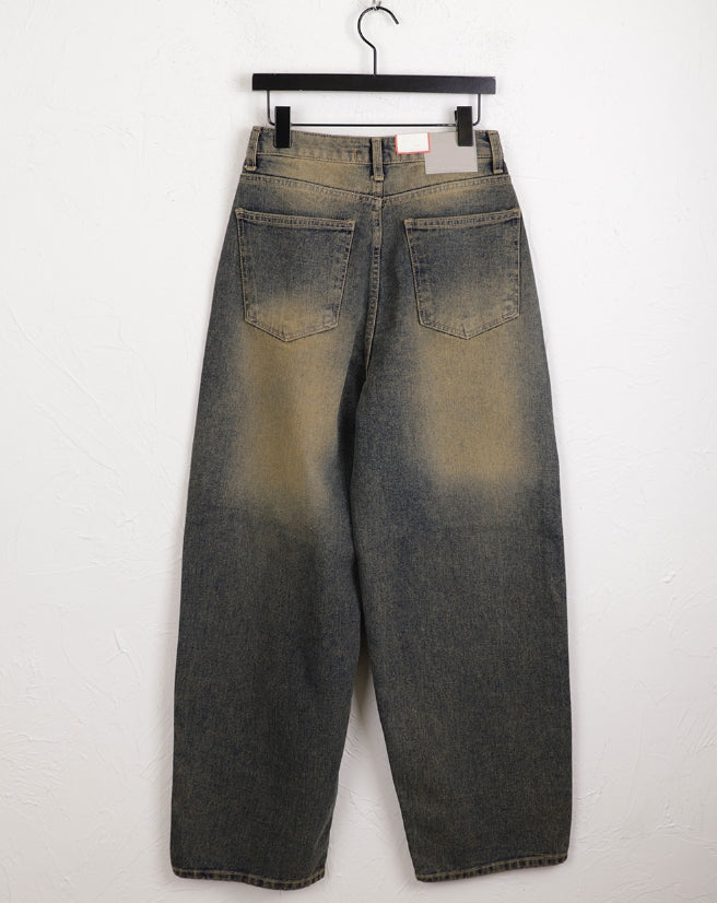 カマイエローウォッシュ加工ビンテージロングワイドデニムパンツ