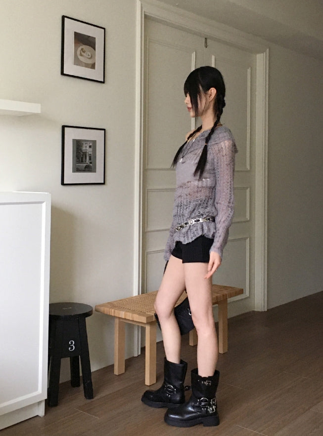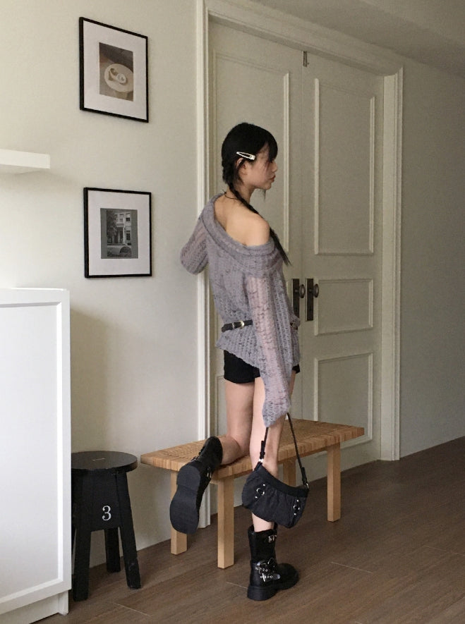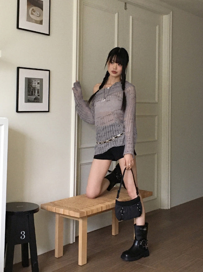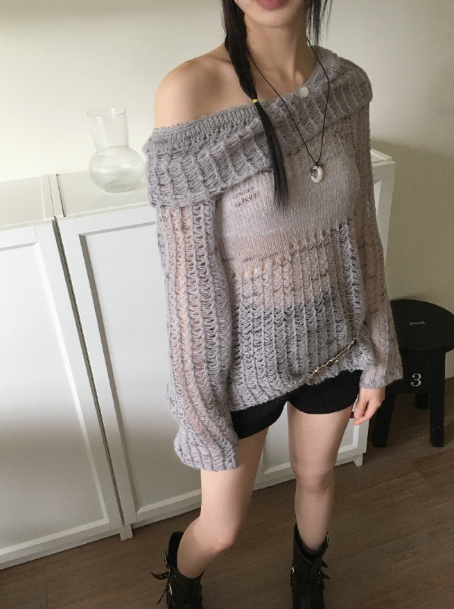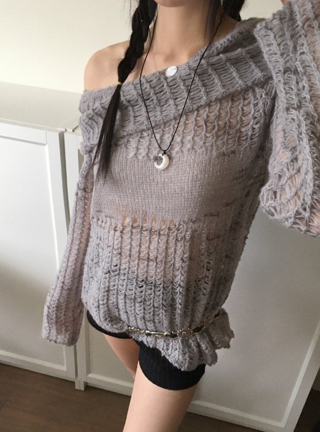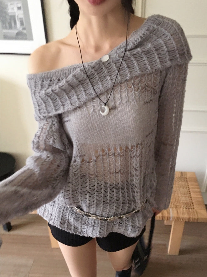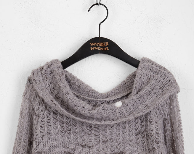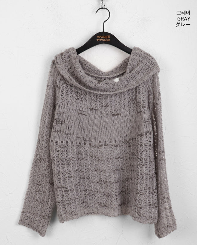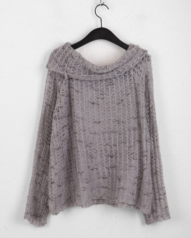 シャローボタンカラーメッシュワンショルダー長袖ニット
