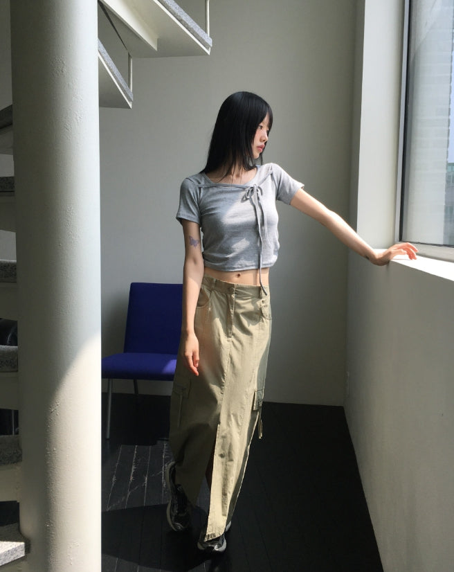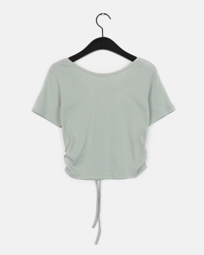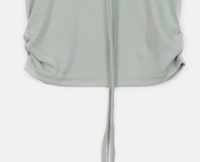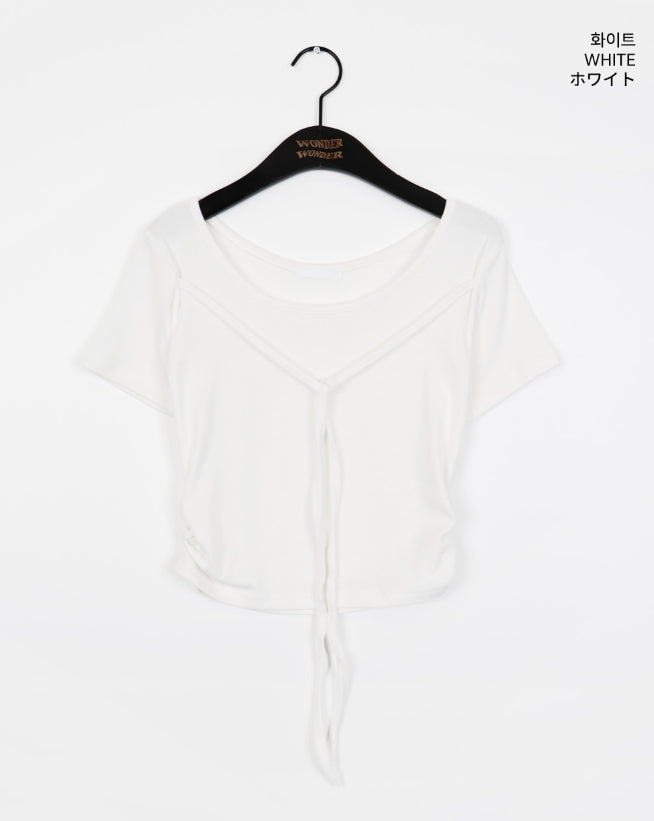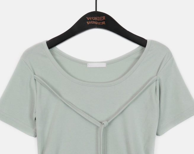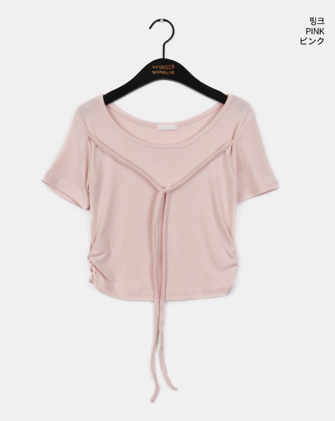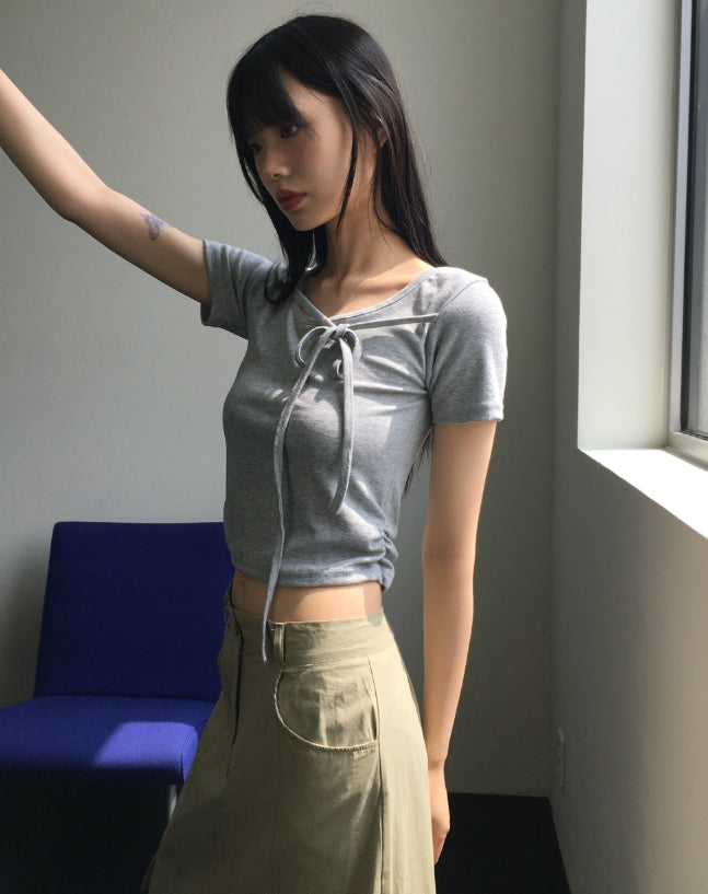 Chano Ribbon Strap Round Shirring Cropped Short-Sleeved T-Shirt