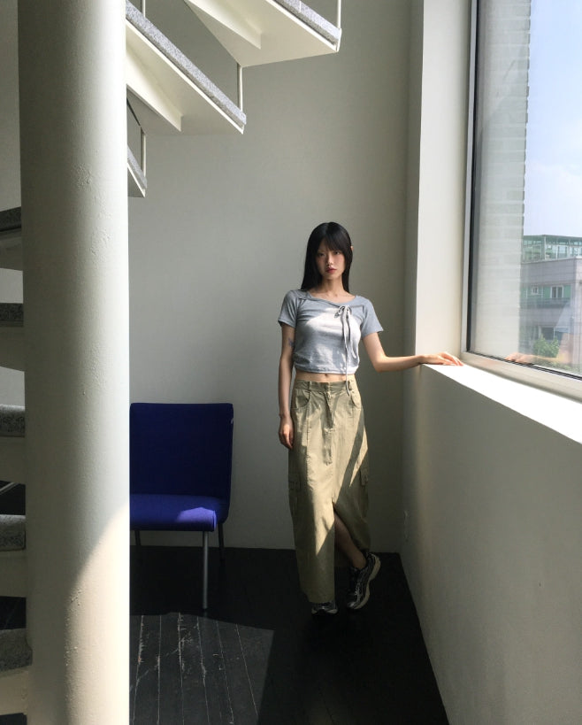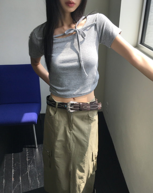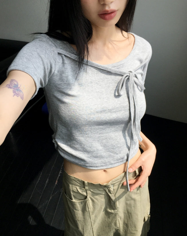 チャノリボンストラップラウンドシャーリングクロップ半袖Tシャツ