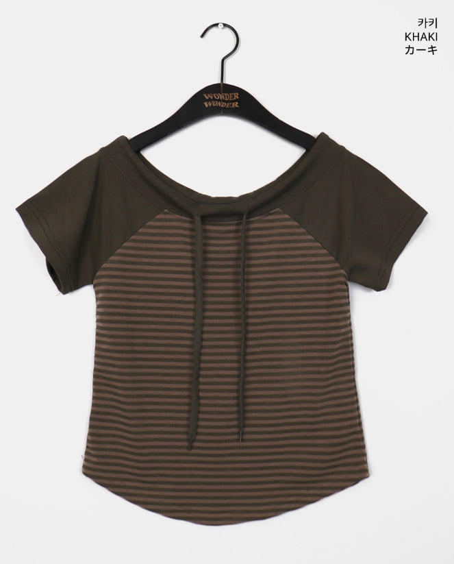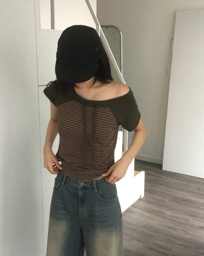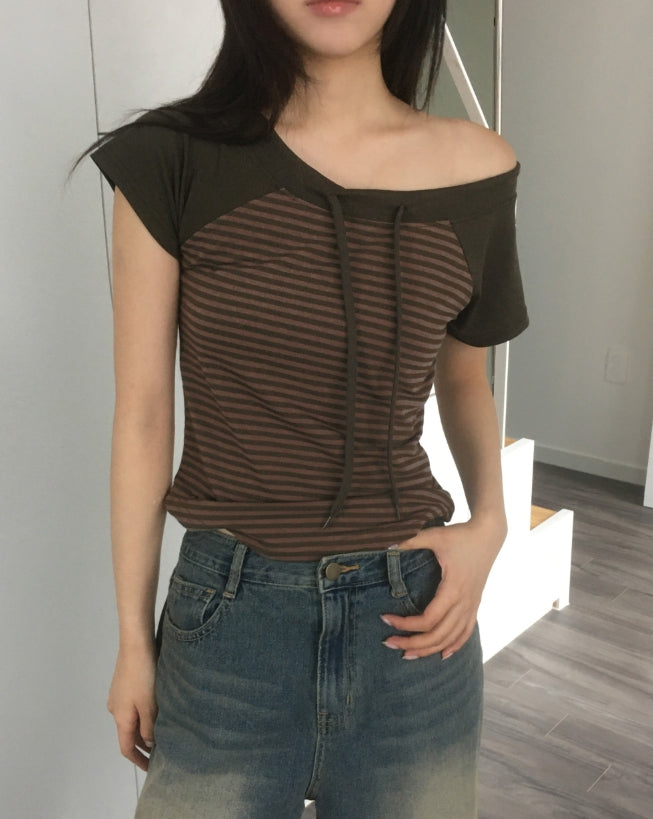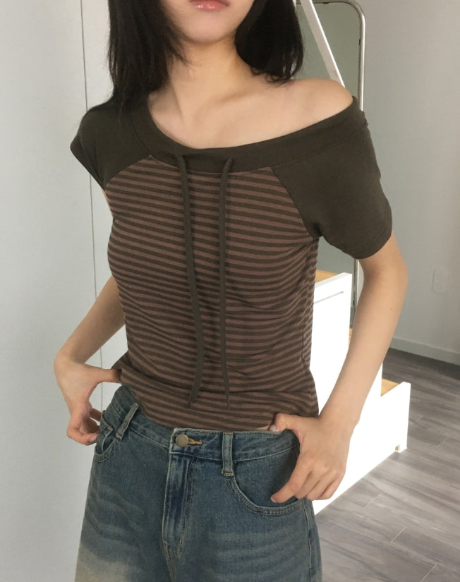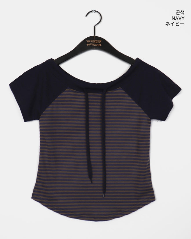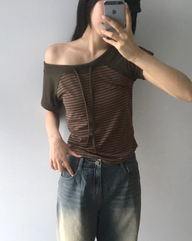 チェンラーストライプオフショルダー半袖Tシャツ