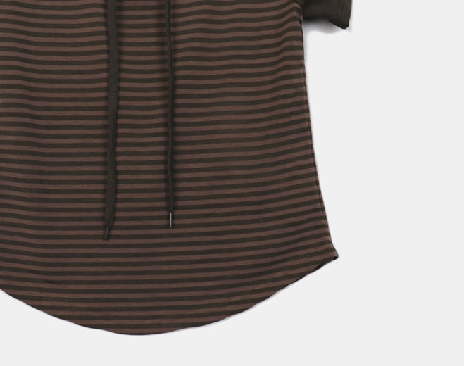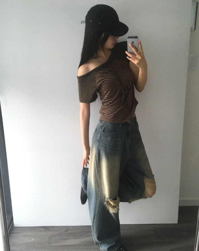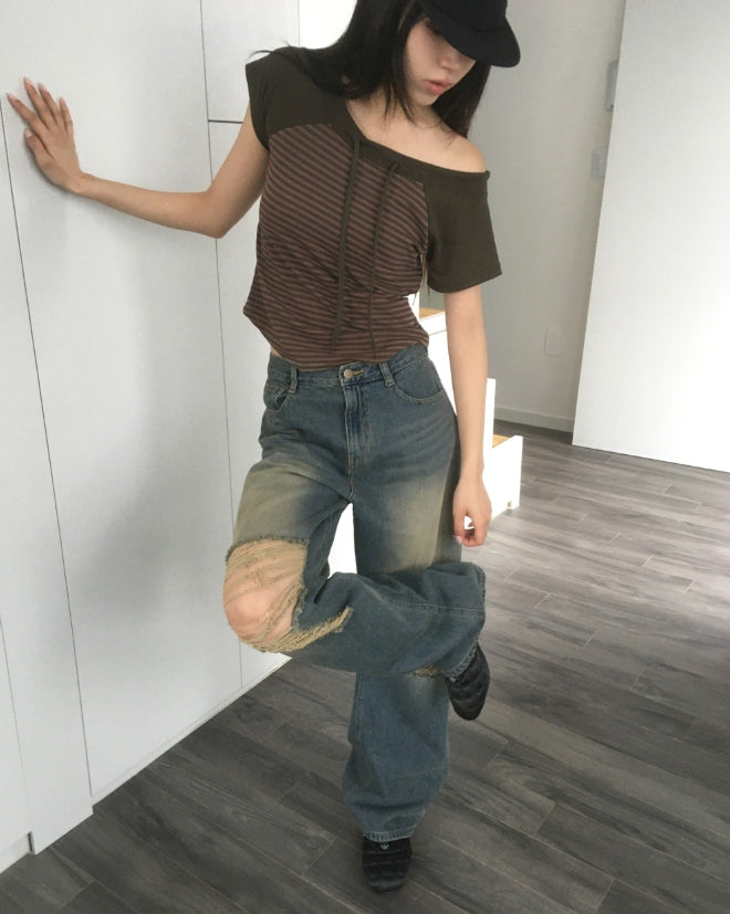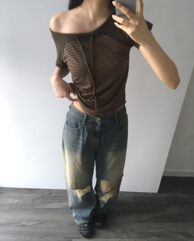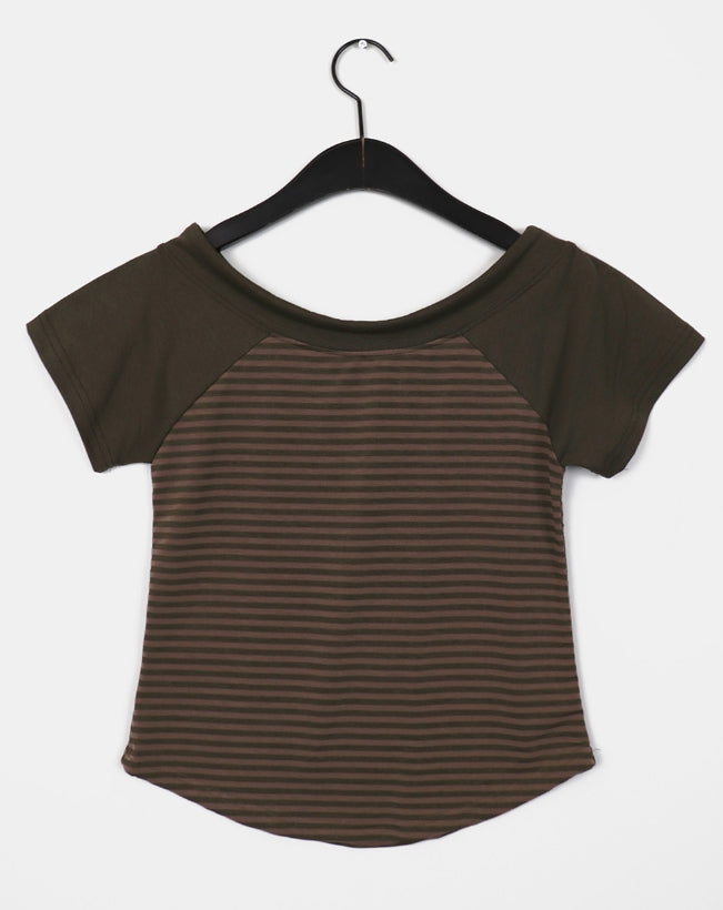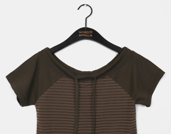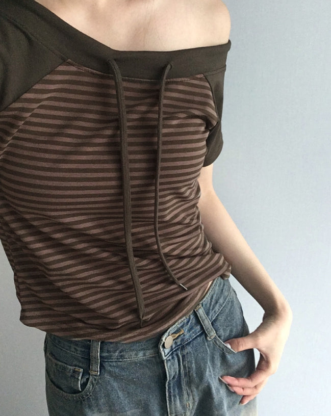 チェンラーストライプオフショルダー半袖Tシャツ