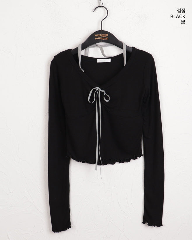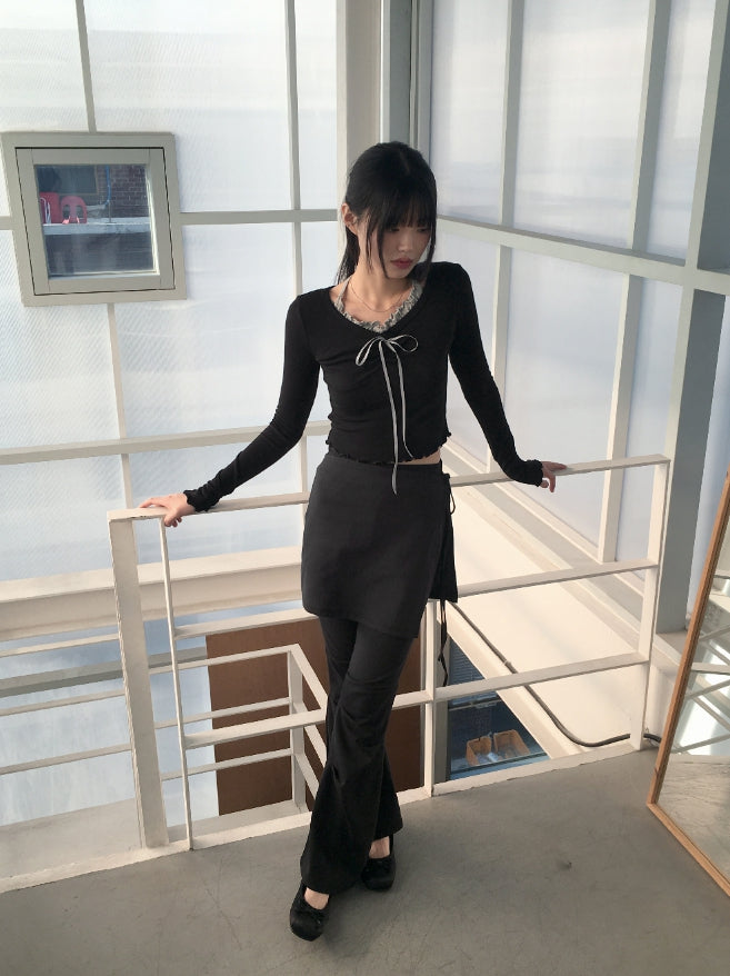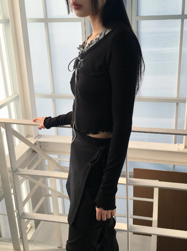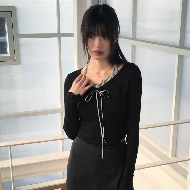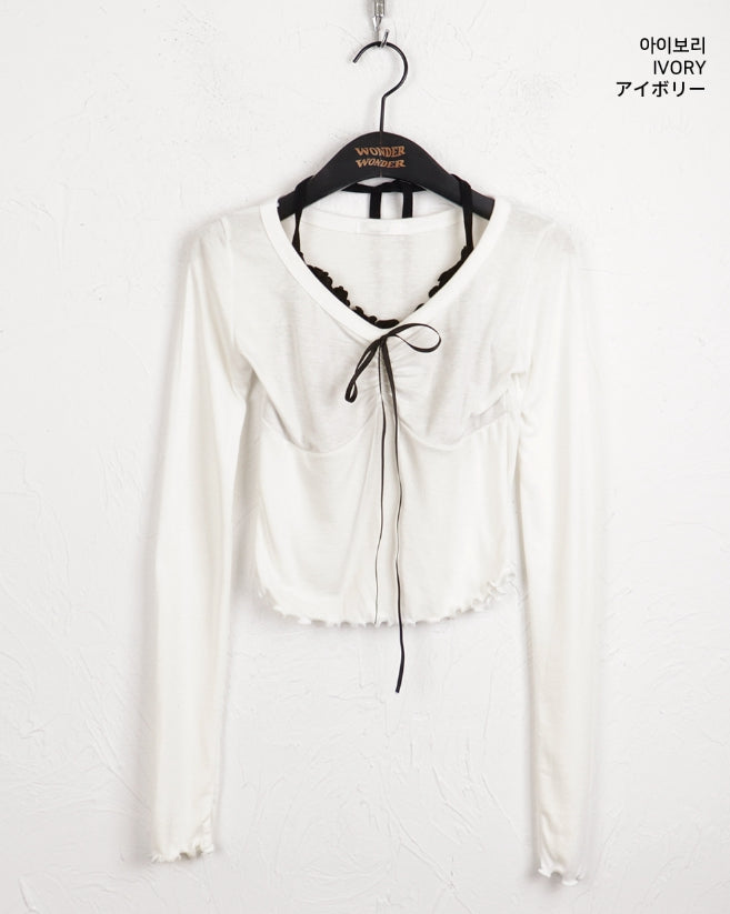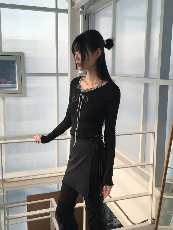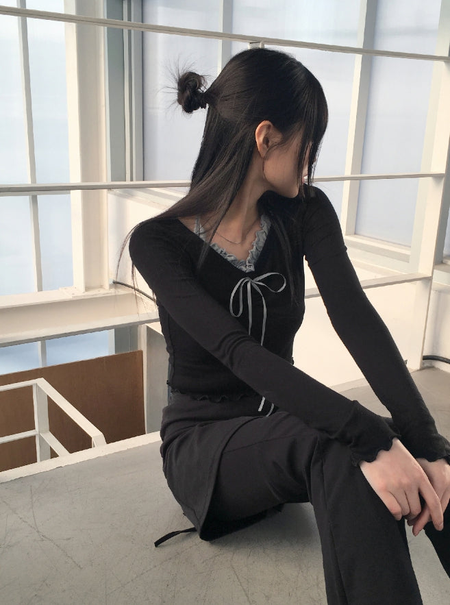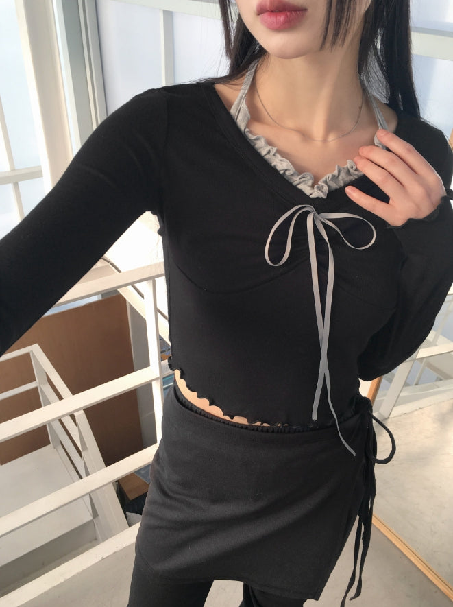 Chilling Ballet Core Shirring Ribbon Wave Sleeveless All-in-One Long-Sleeved T-shirt