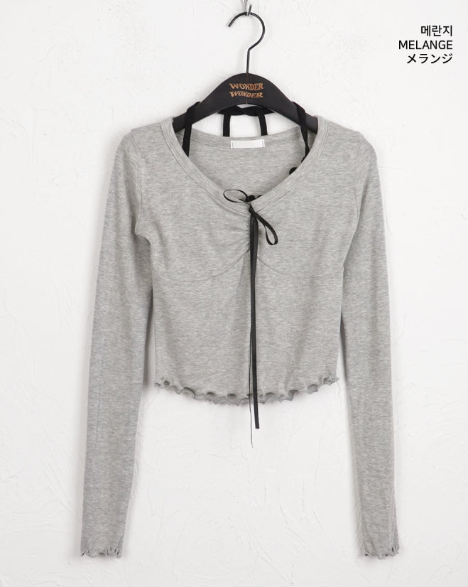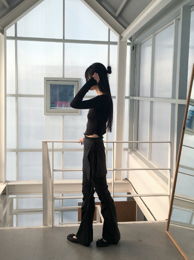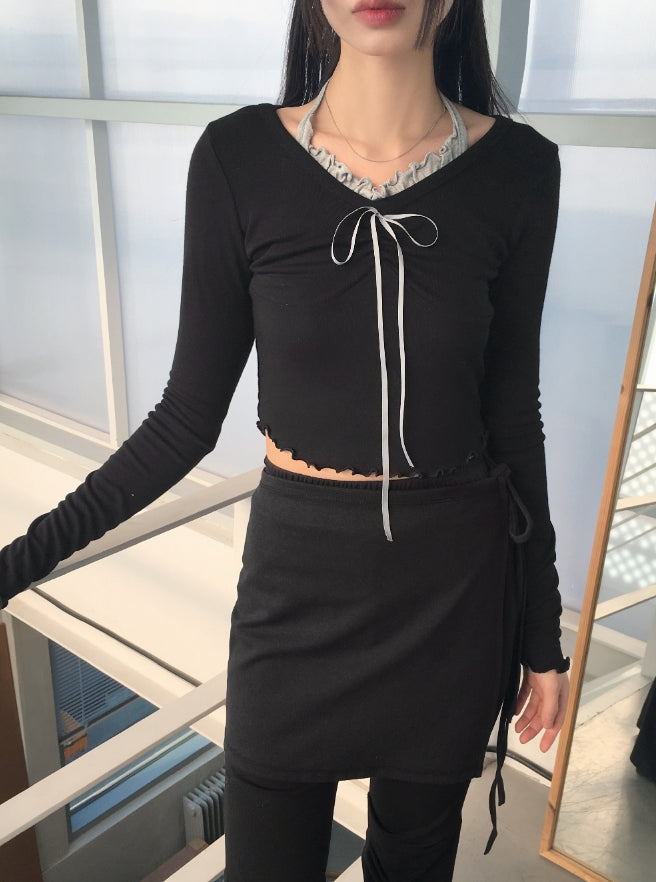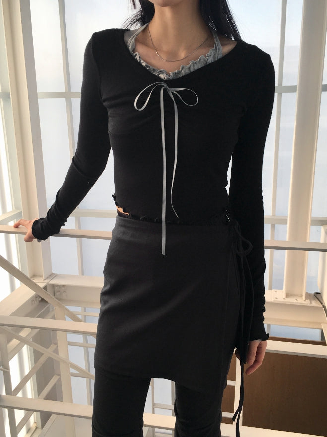 Chilling Balletcore Shirring Ribbon Wave Sleeveless All-in-One Long-Sleeved T-shirt