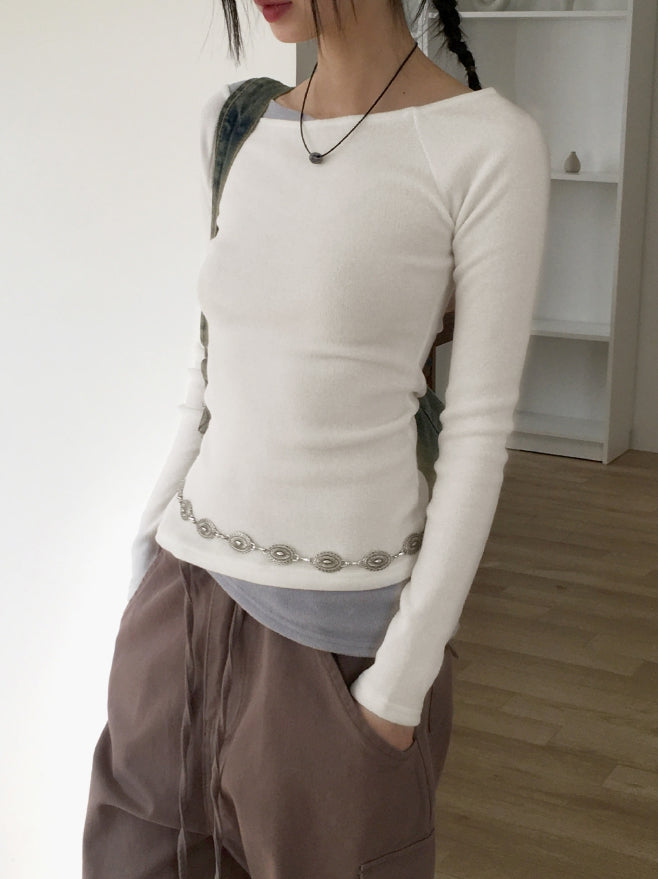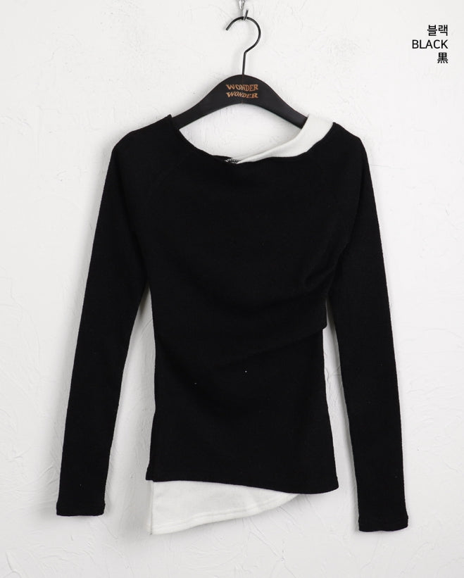 Chiss shirring layered diagonal off-shoulder long sleeve T-shirt