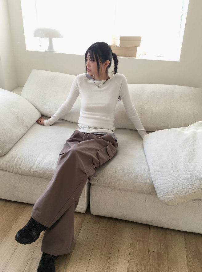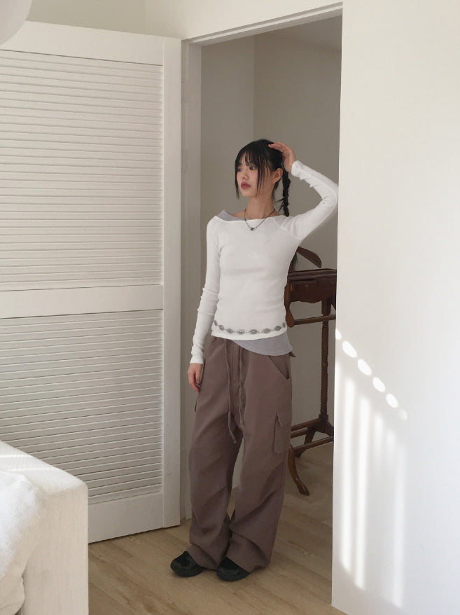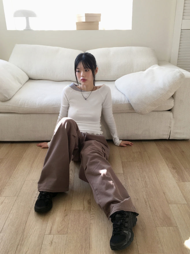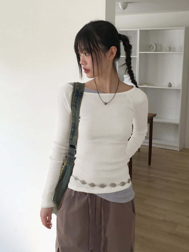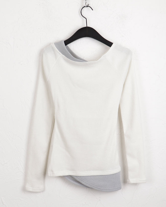 チスシャーリングレイヤードオフショルダー長袖Tシャツ