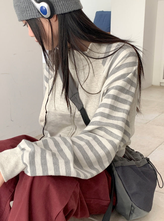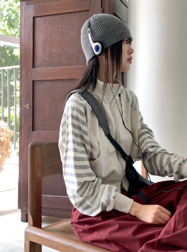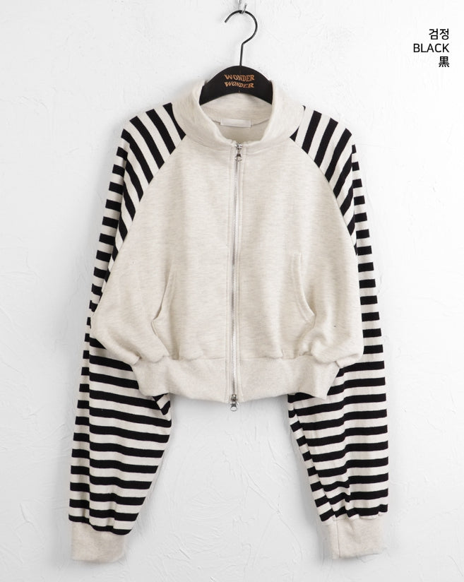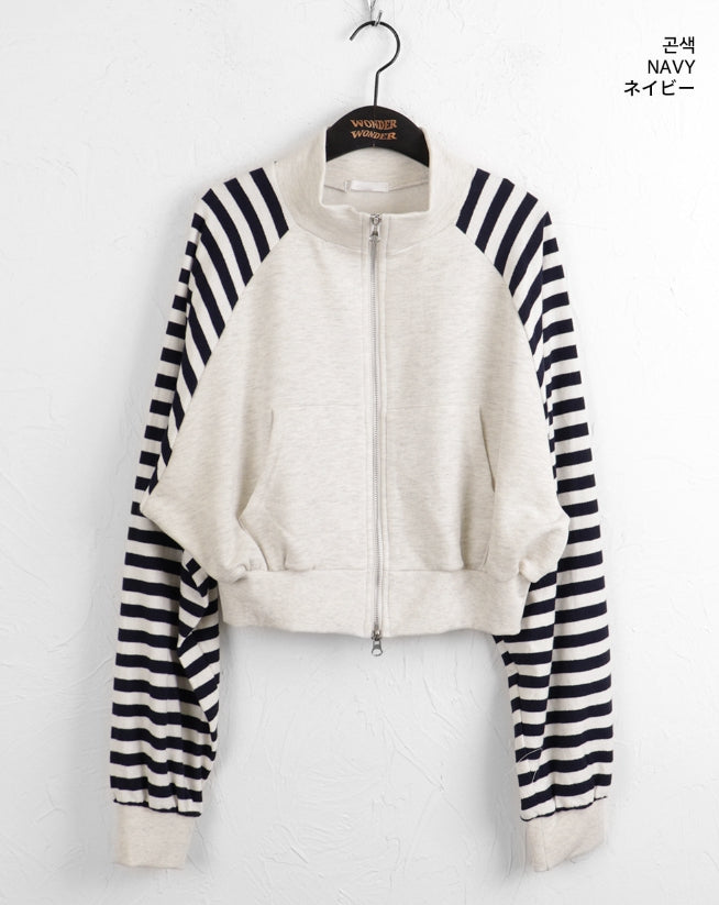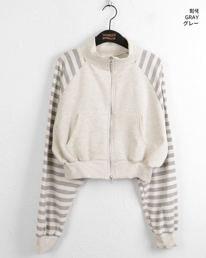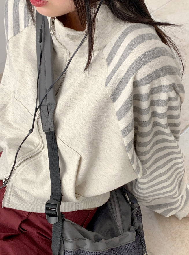 Choit Stripe Color Matching Half Neck Two-Way Pile Crop Zip-Up