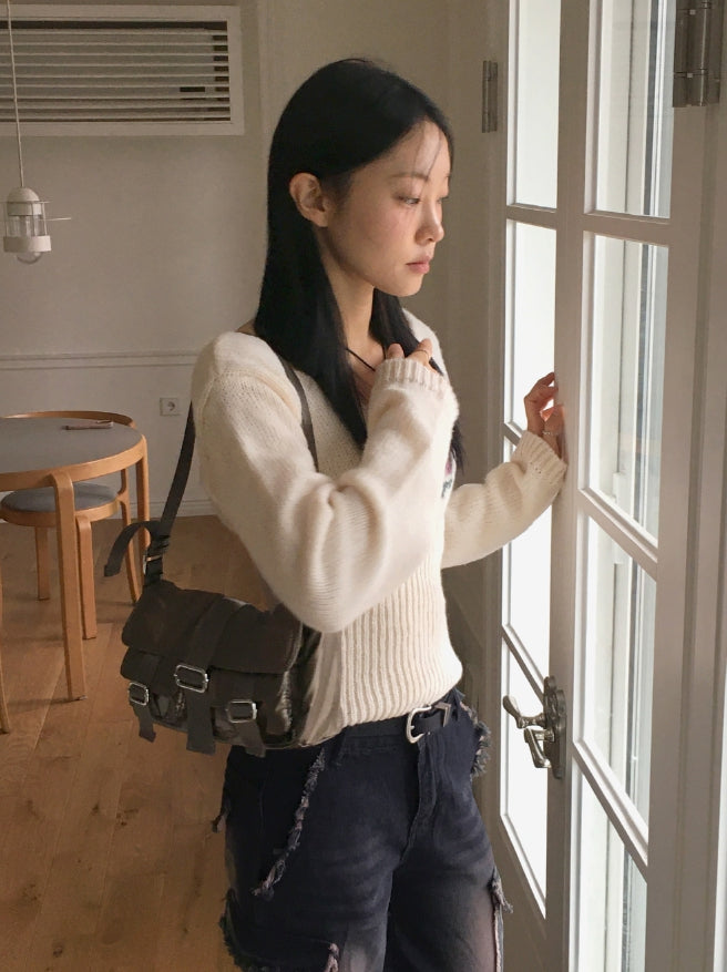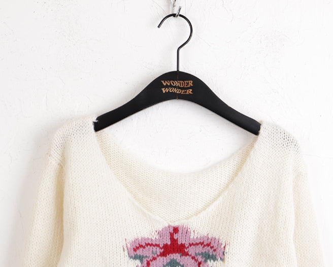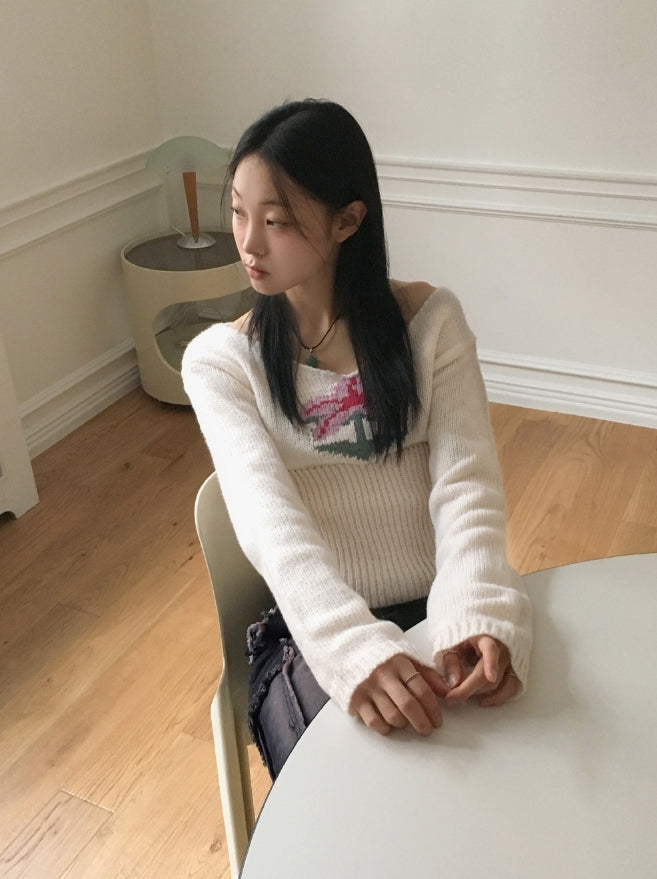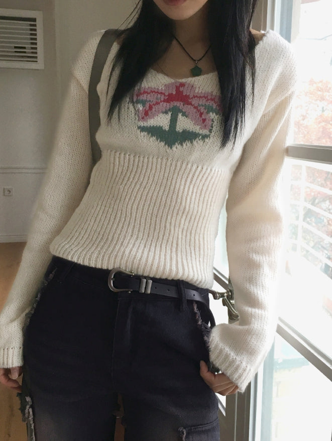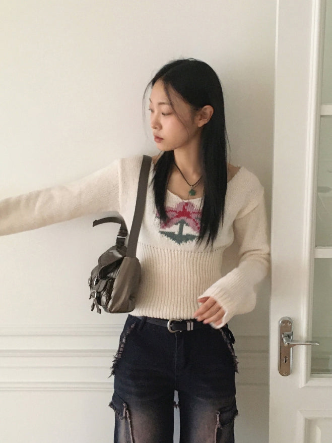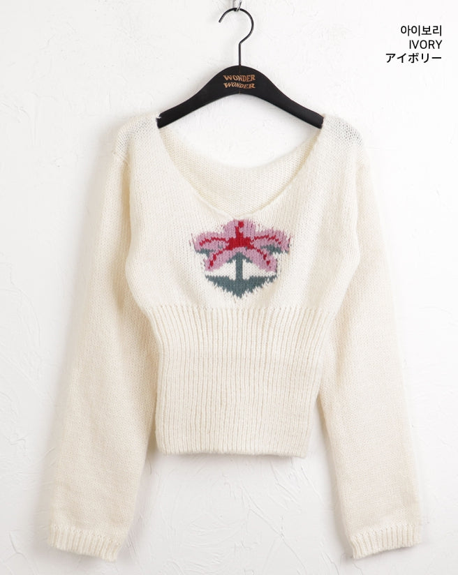 Claim Deep U-Neck Flower Slim Long Sleeve Knit