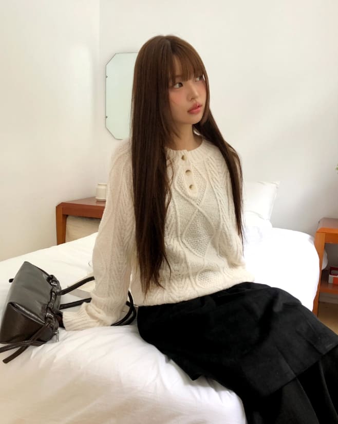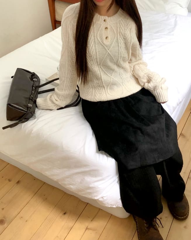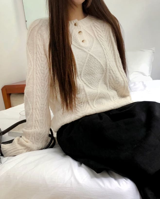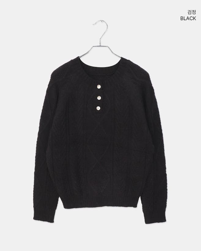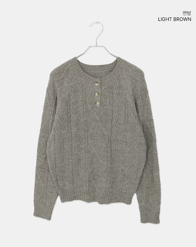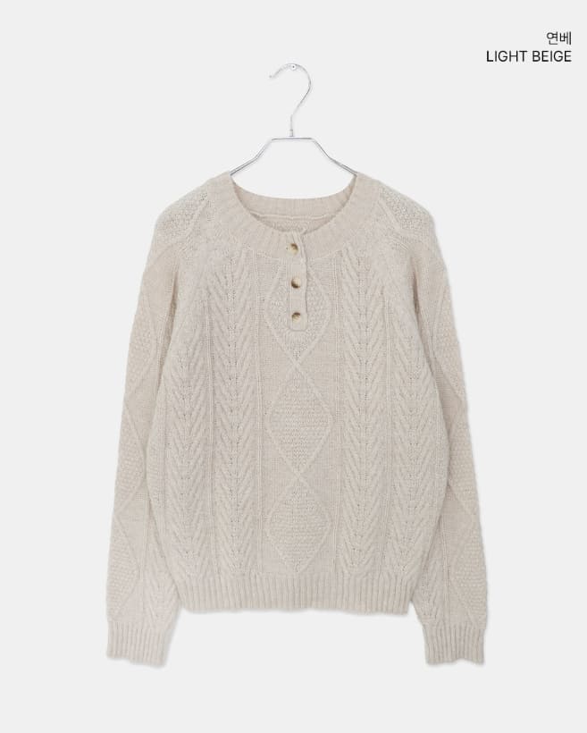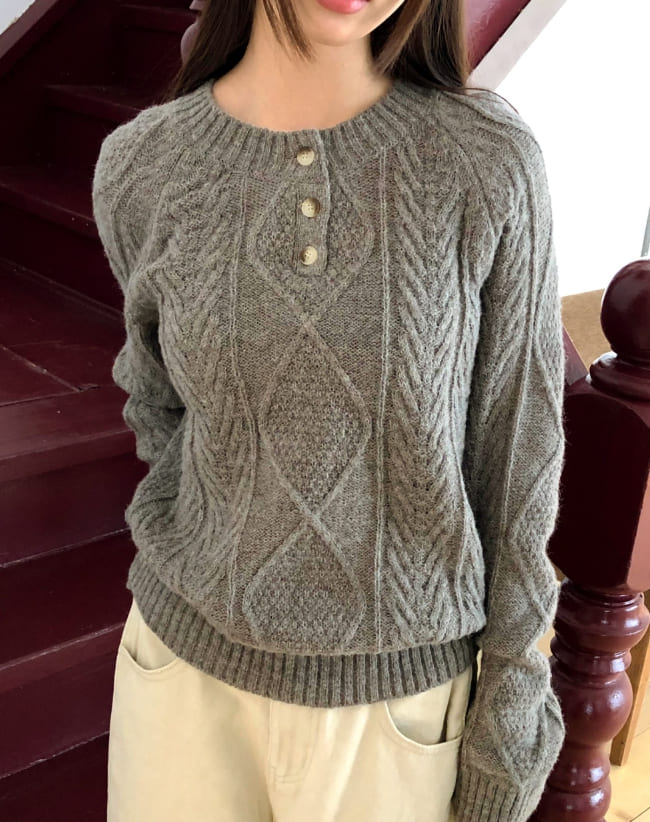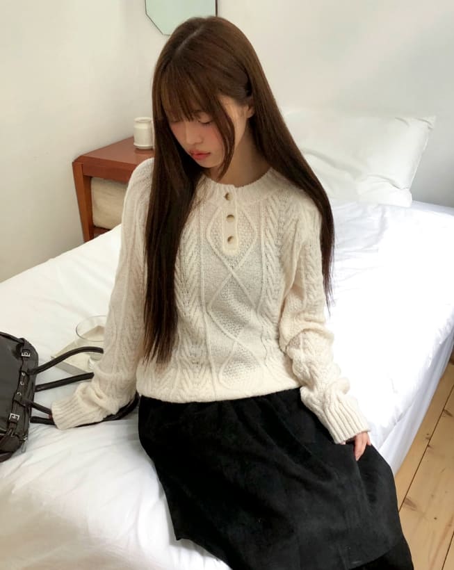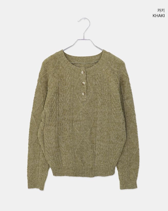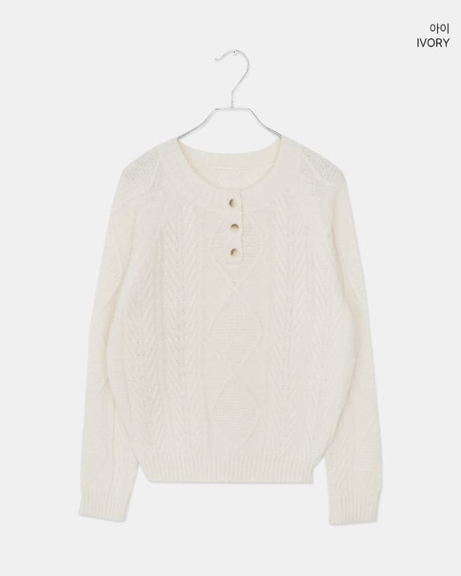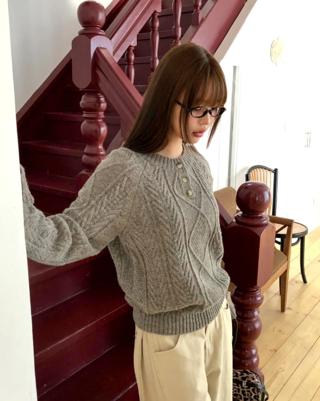 ドハケーブルヘンリーネックボタン長袖ニット