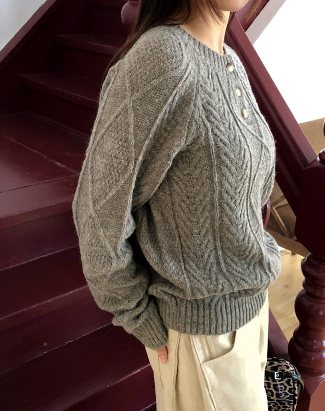 ドーハプレッツェルヘンリーネックボタン長袖ニット