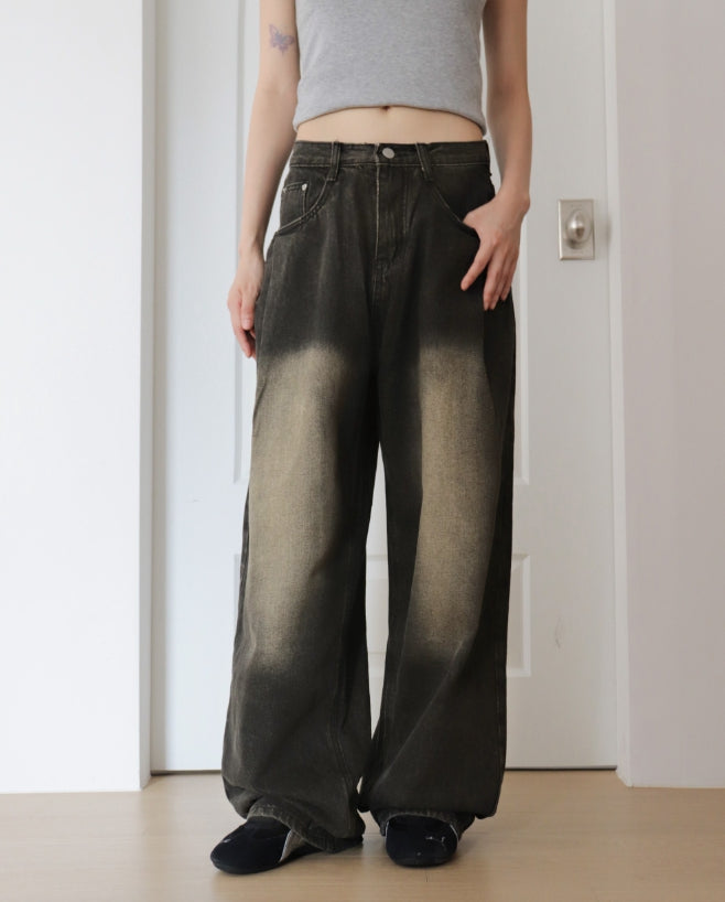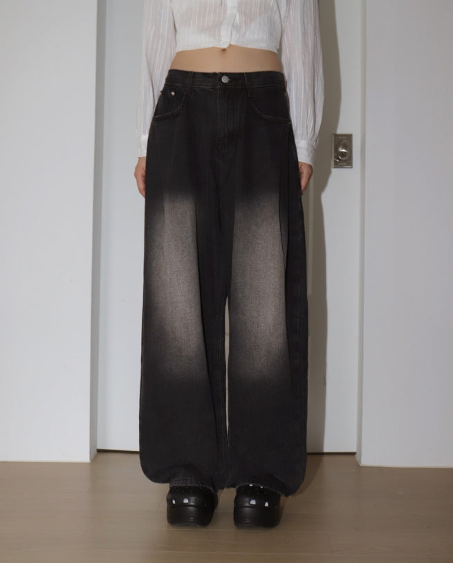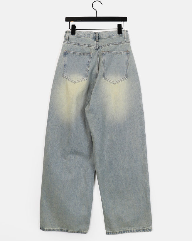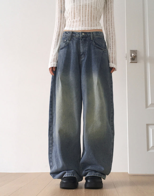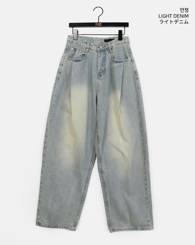 イートンワンピンタックウォッシュ加工ワイドデニムパンツ