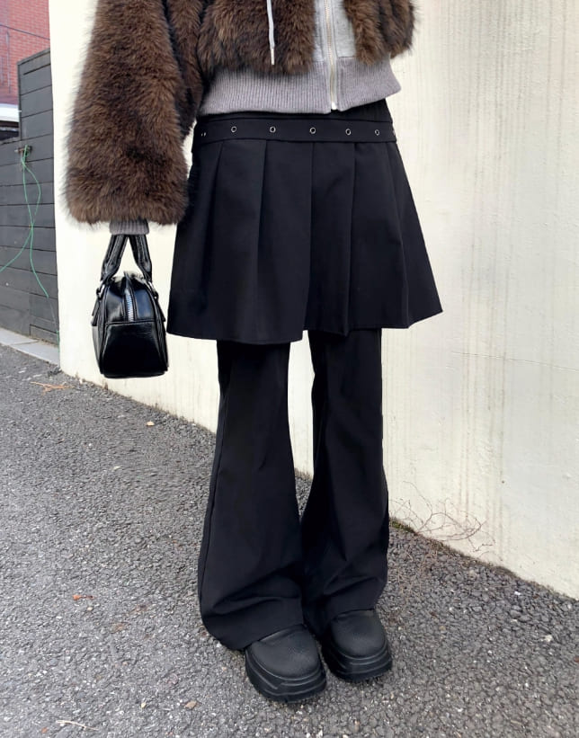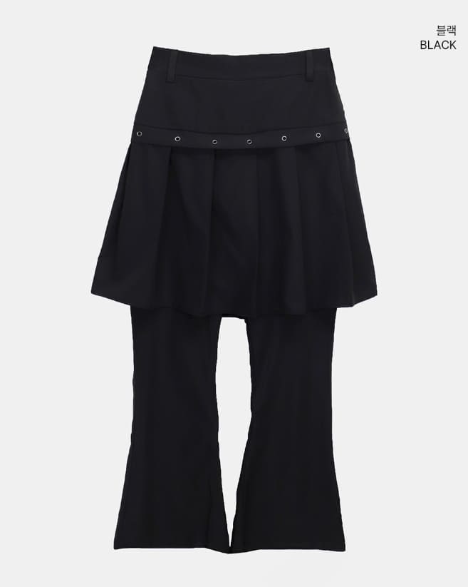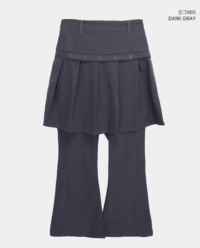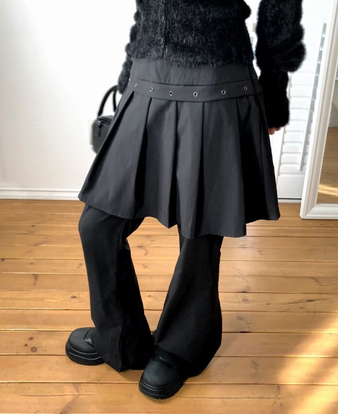 [重ね着風] ルアンアイレットレイヤードミディプリーツブーツカットスカートパンツ