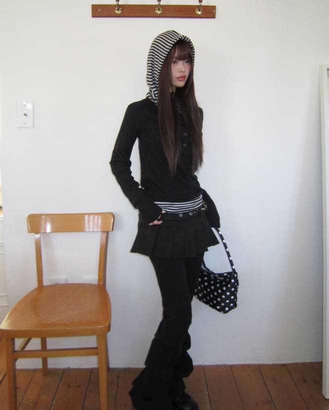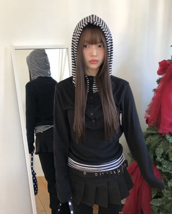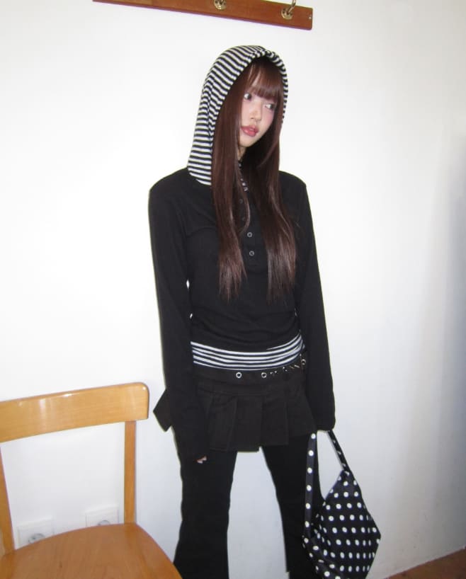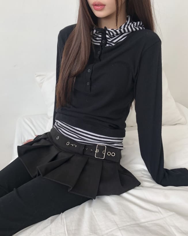 ジアンハイネック配色フリスフードTシャツ