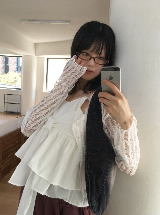 ハズリボンタイ紐フレア袖なしブラウス