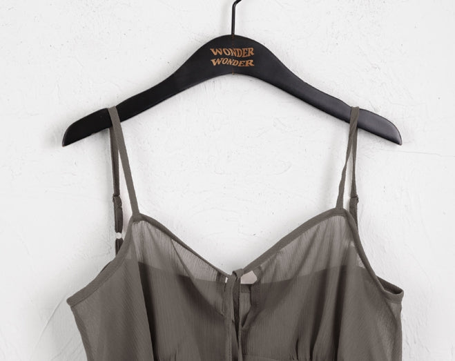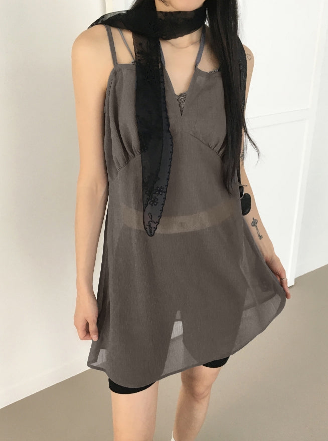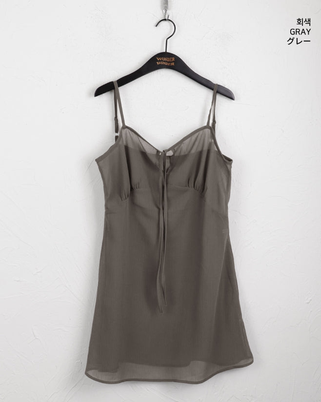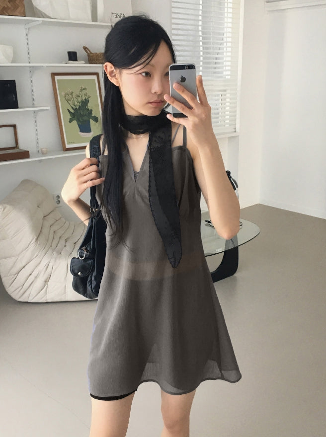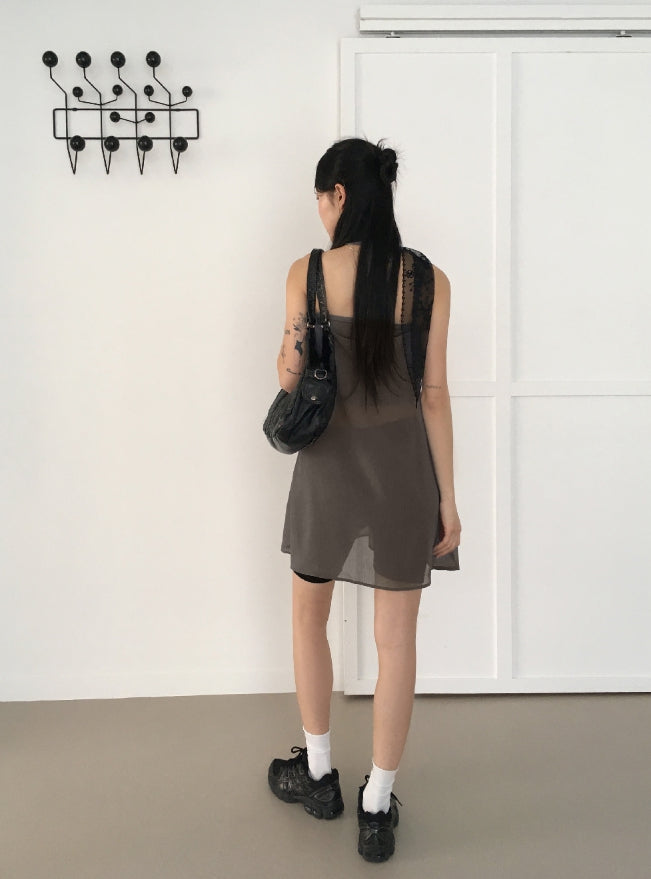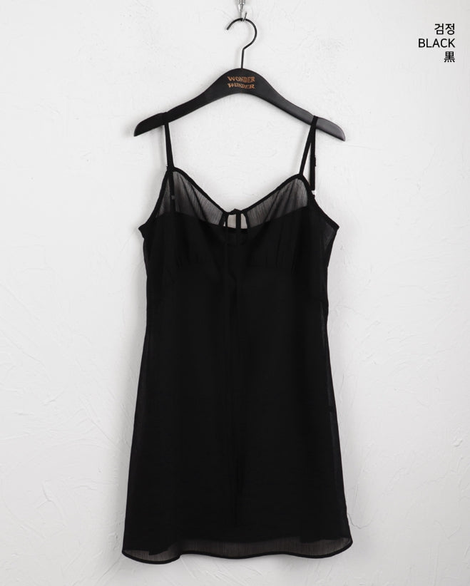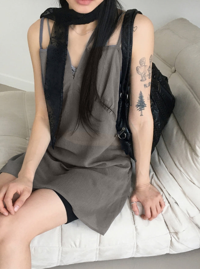 Heple See-Through Slit Ribbon Strap Adjustable Layered Sleeveless Mini Dress
