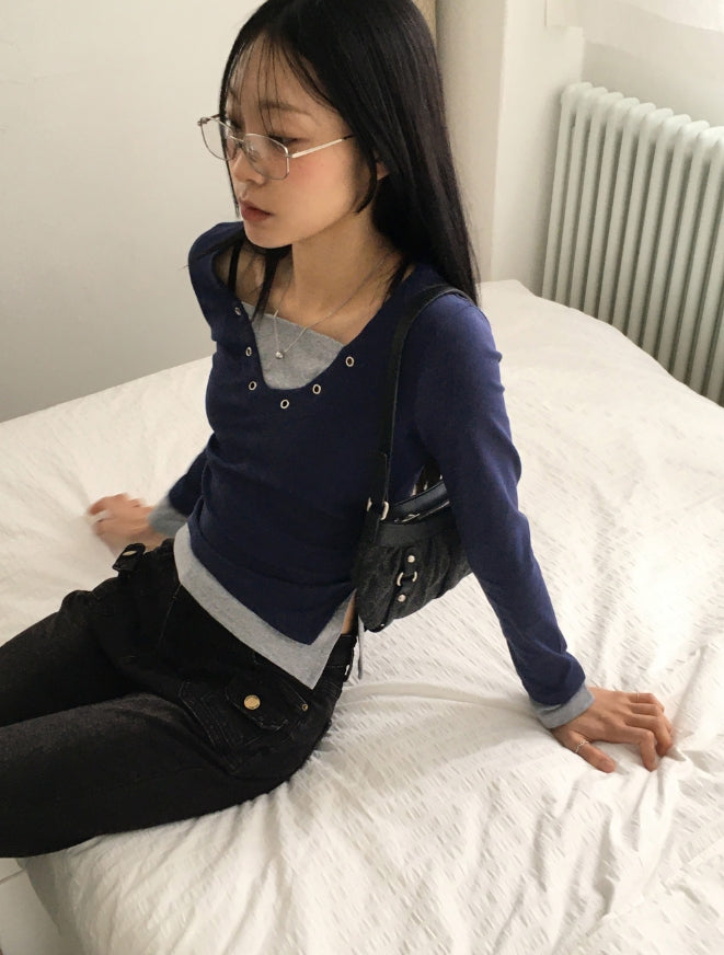 Jetty Layered Coloring V-Neck Long-Sleeved T-Shirt