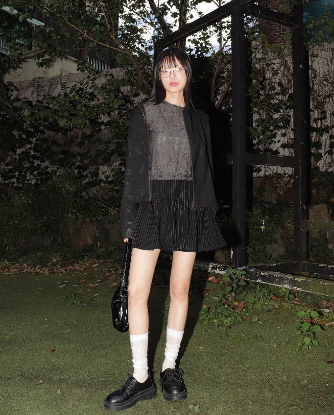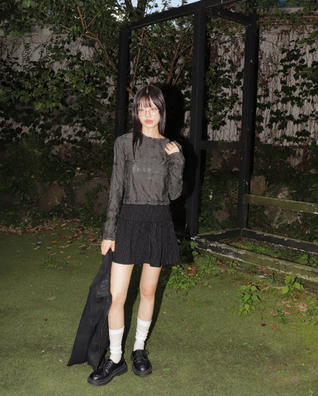 Carcon Damage During the Change of Seasons Shirring Round Long-Sleeved T-shirt
