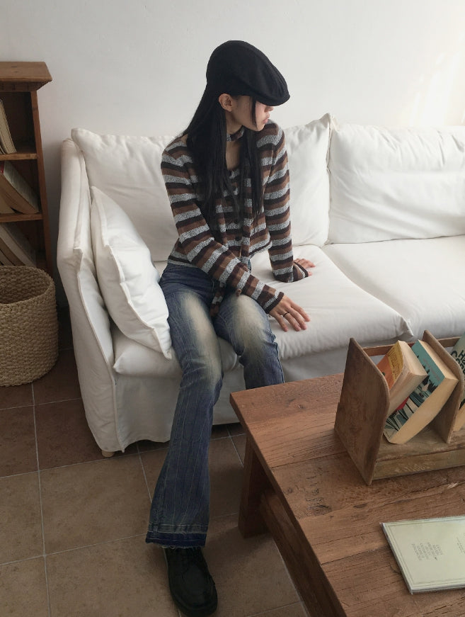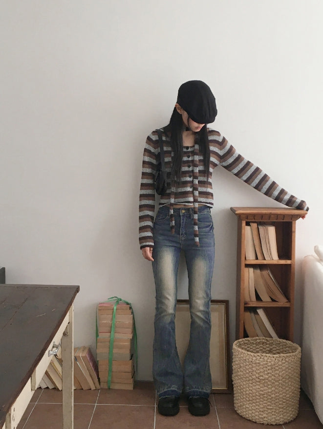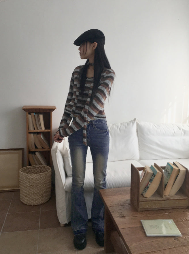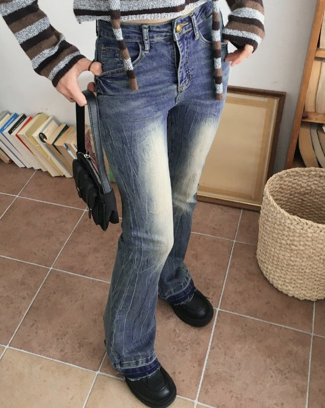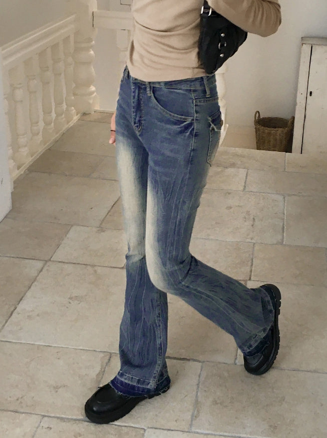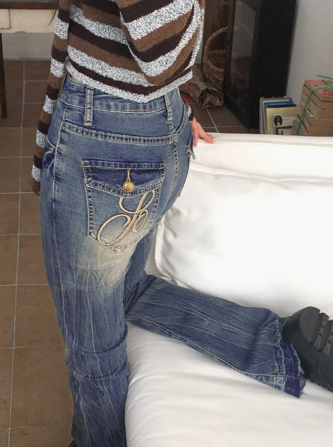 Kimman Y2K Crack Washing Gold Embroidery Long Bootcut Denim Pants