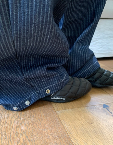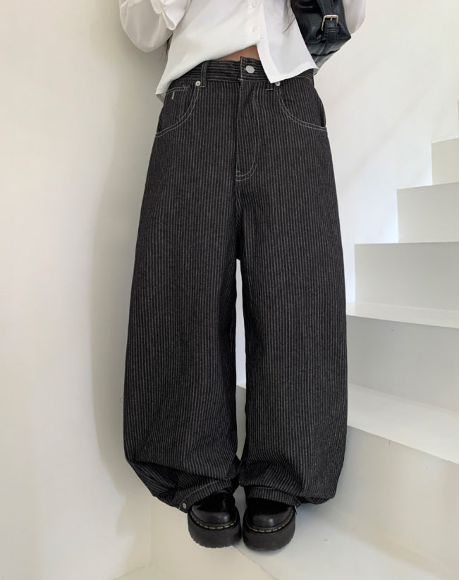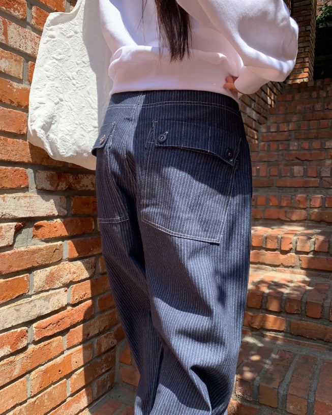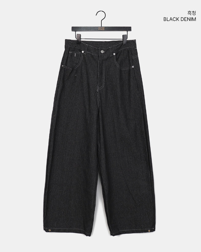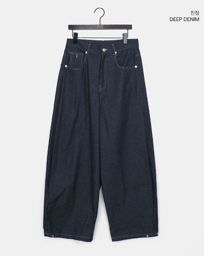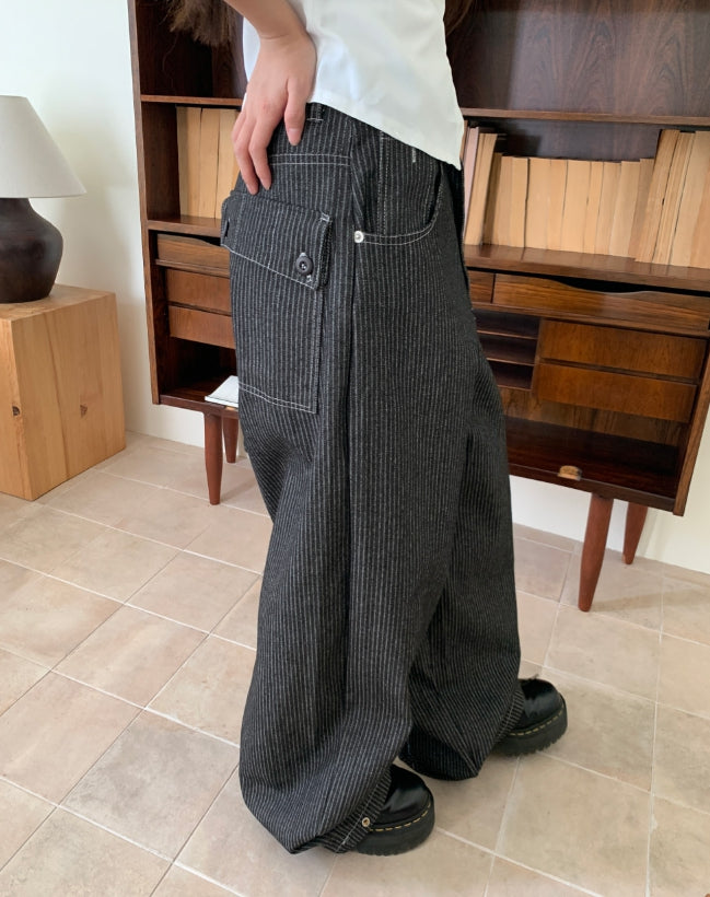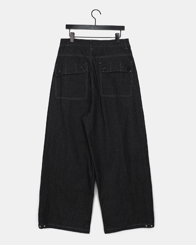 Lemming Stripe Big Pocket Snap Button Denim Wide Long Pants