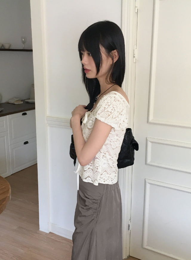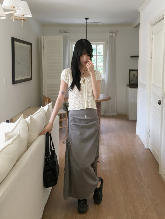 [MADE] Kissch Eyelet Ribbon Shirring Pocket Nylon Long Skirt