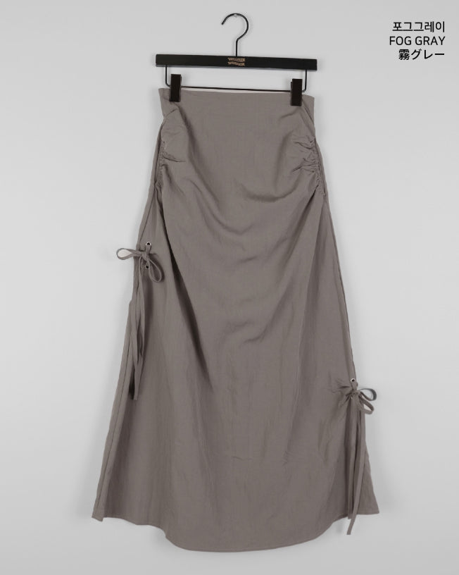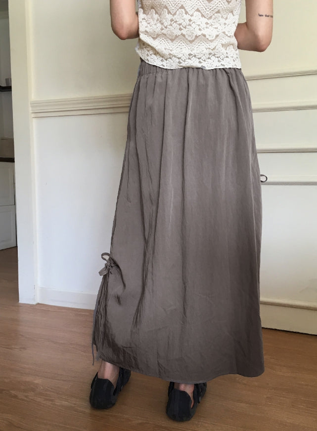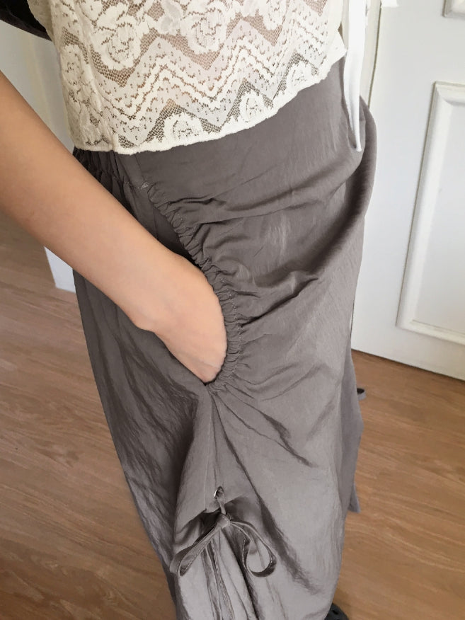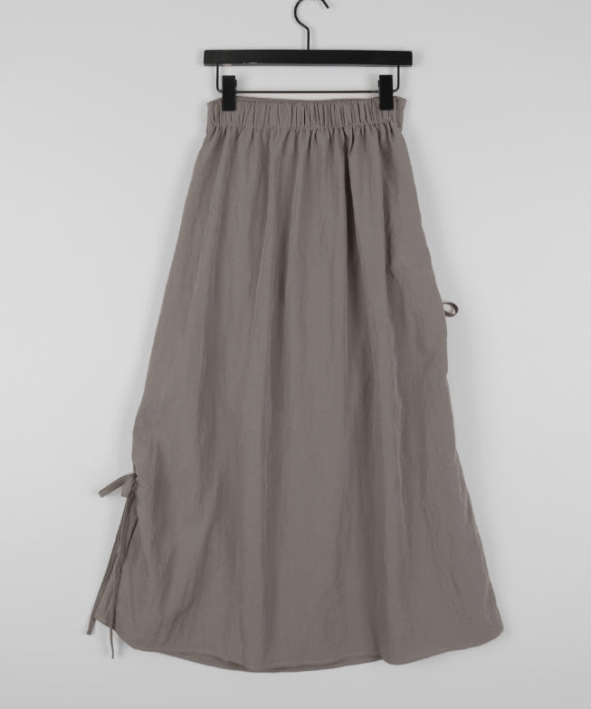 [MADE] Kiswi Eyelet Ribbon Shirring Pocket Nylon Long Skirt