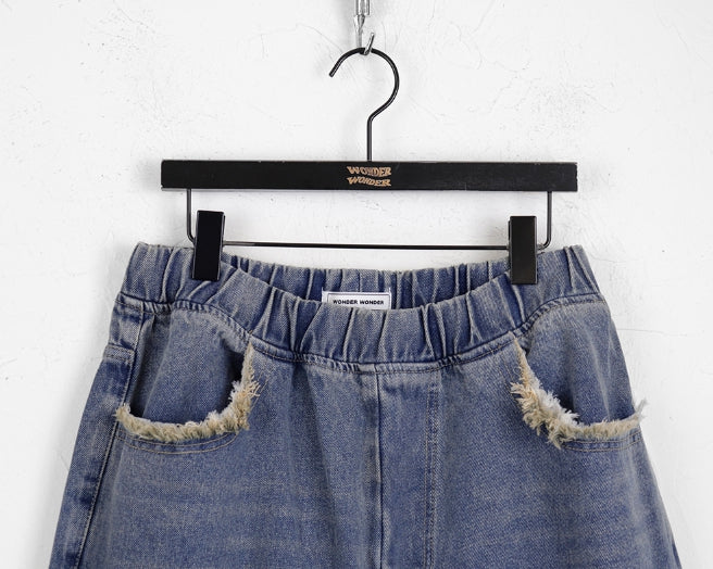 [MADE]ビラードサージカルダメージウォッシュ加工バンディングロングワイドデニムパンツ