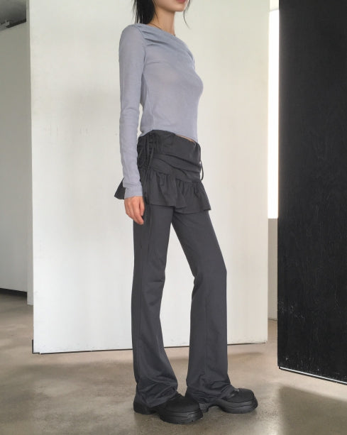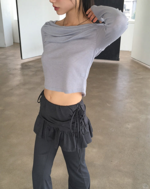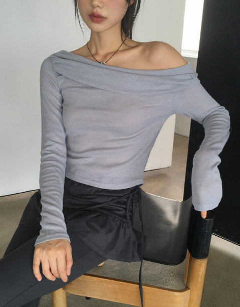 Mebel Shirring Off-Shoulder Back Slit Ribbon Strap Long-Sleeved T-Shirt
