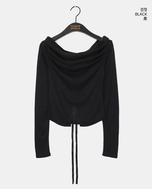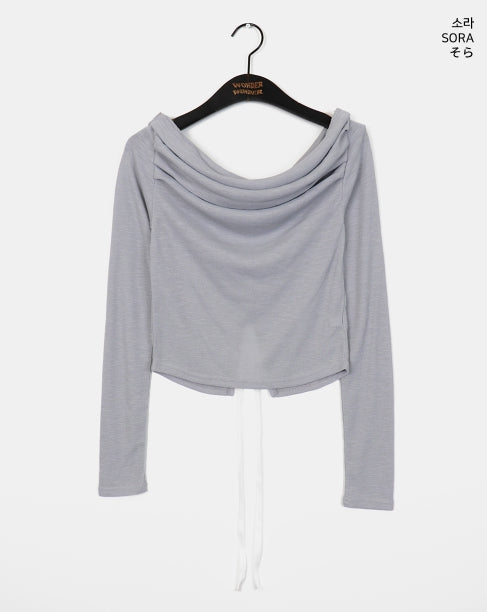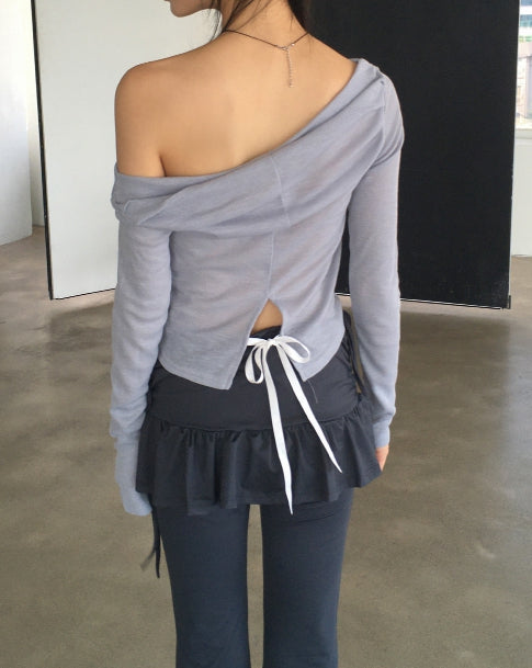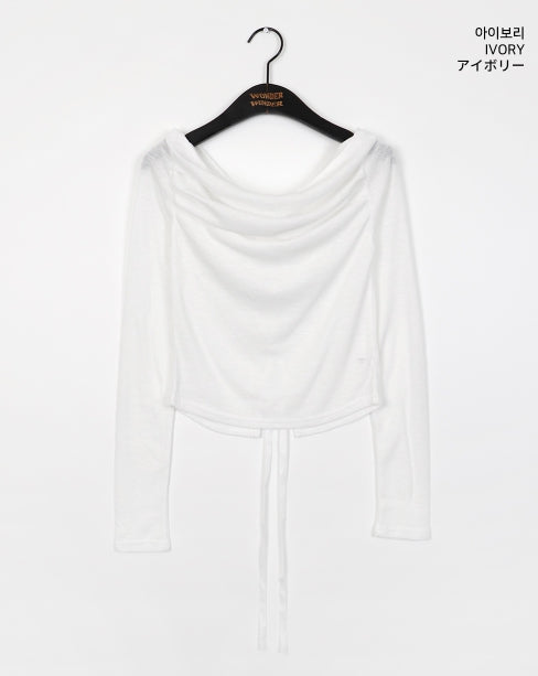 メベルシャーリングオフショルダーバックスリットリボンストラップ長袖Tシャツ