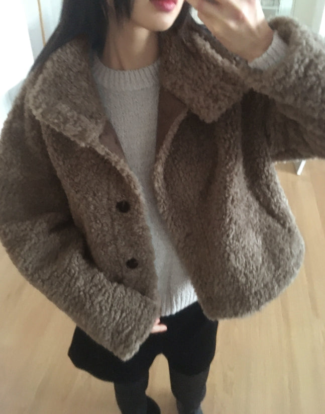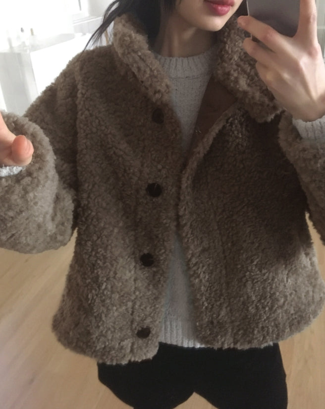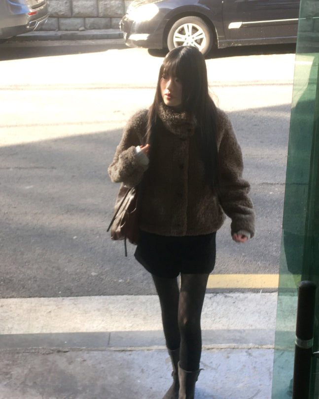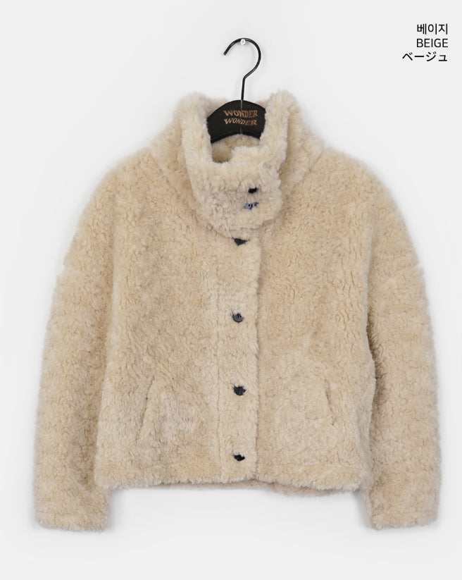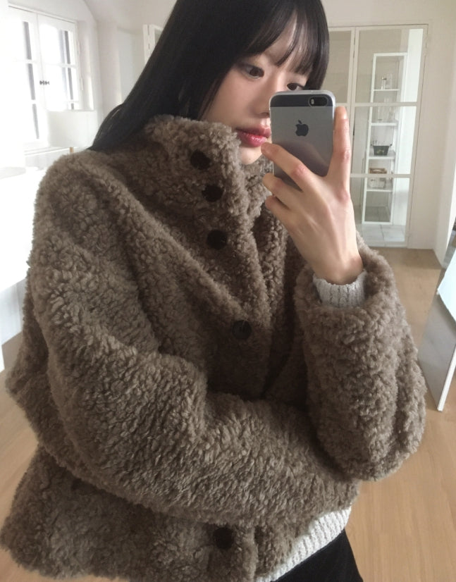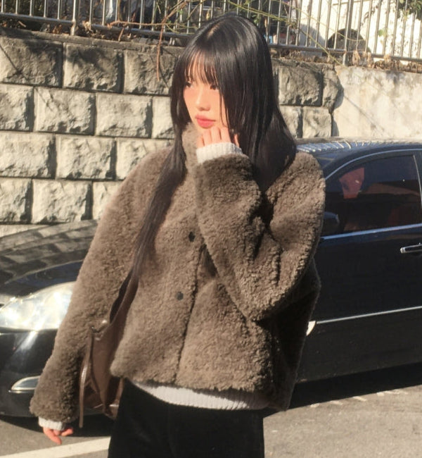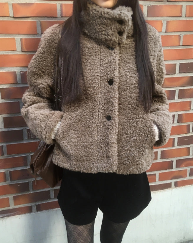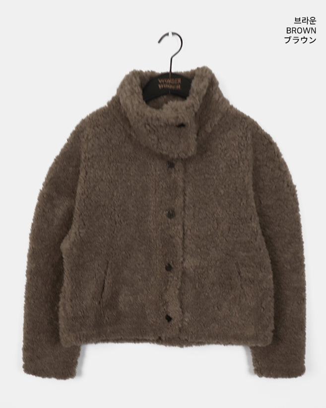 Merve Fluffy Fur Button High Neck Short Jacket