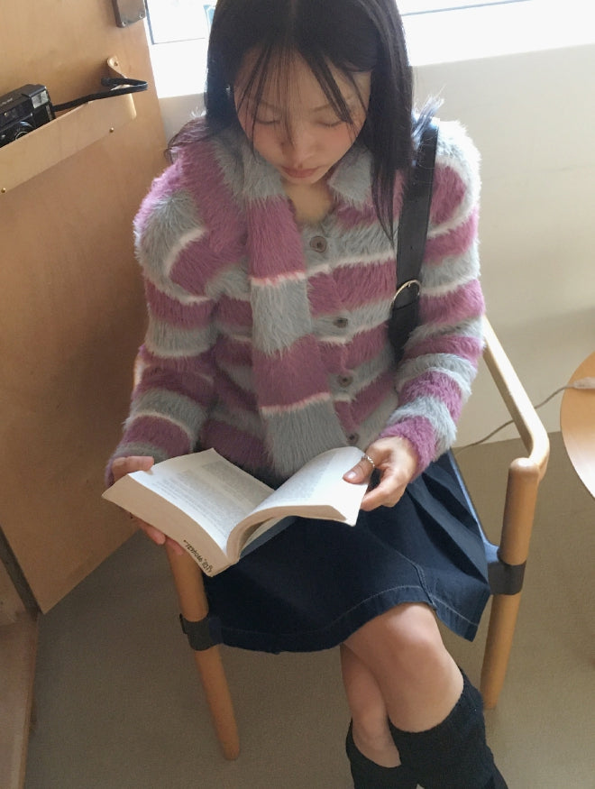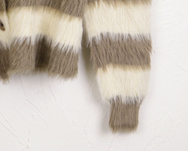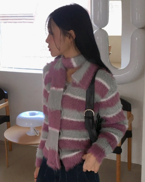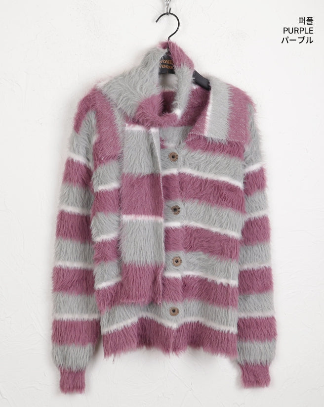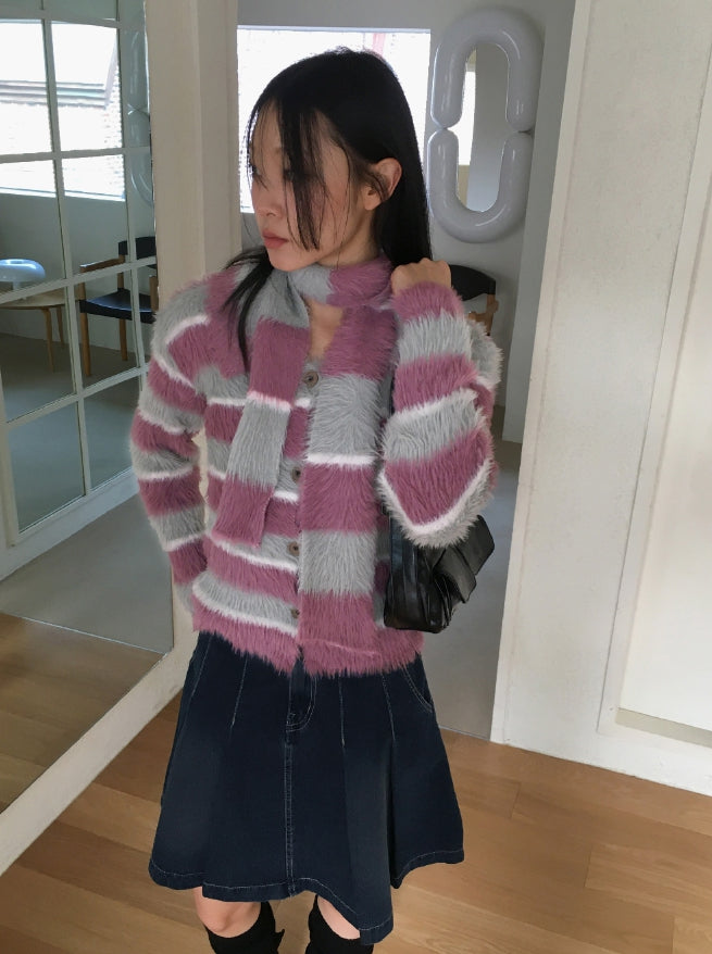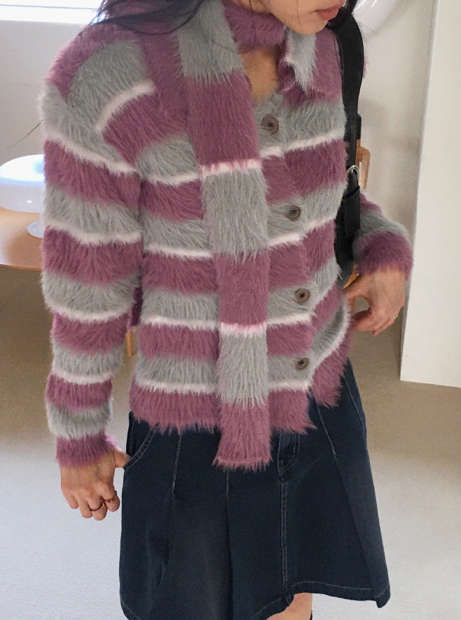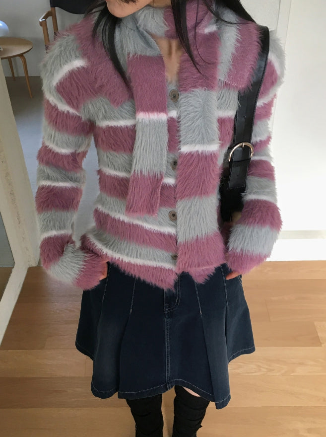 [Muffler Set] Jes Fur Stripe Color Matching Collar Knit Long Sleeve Cardigan