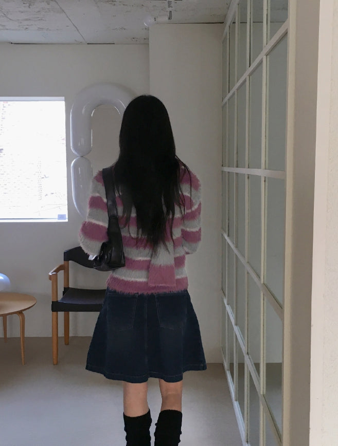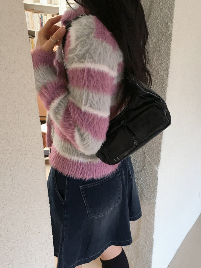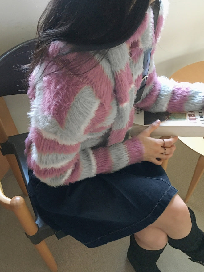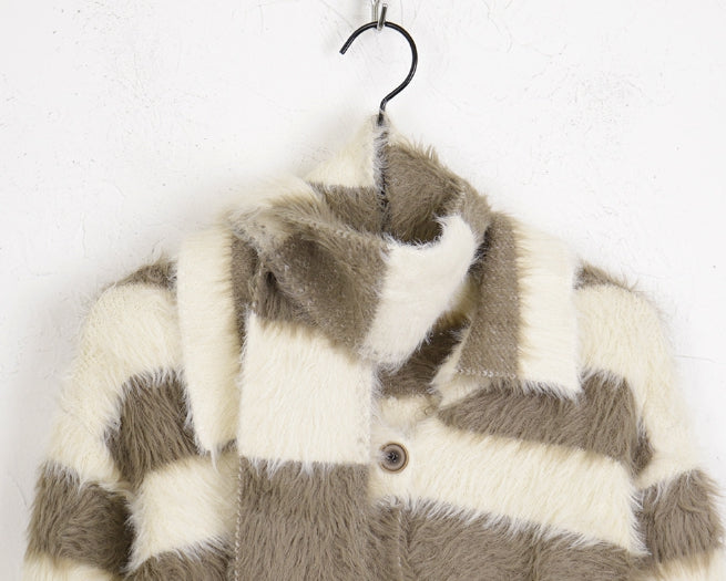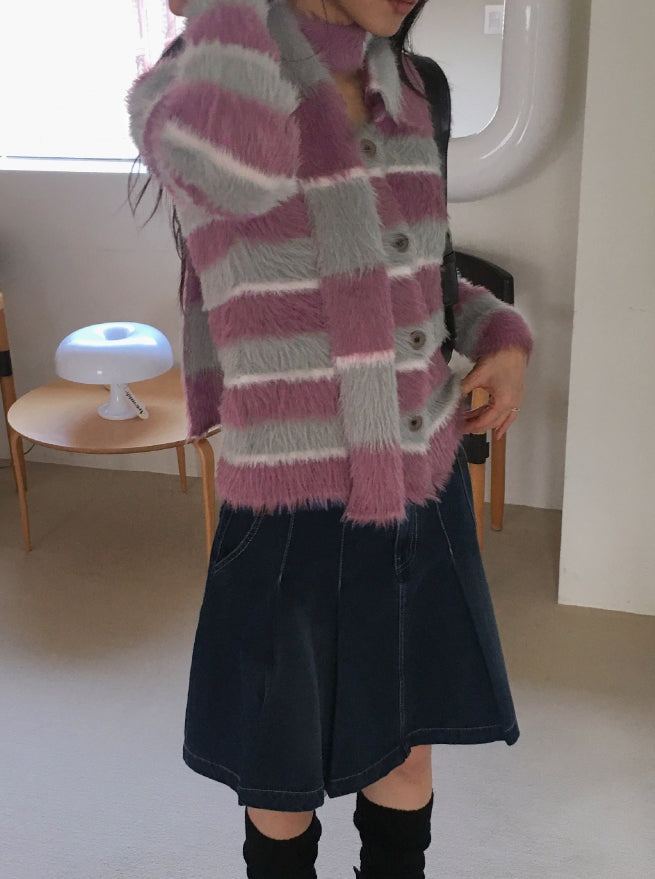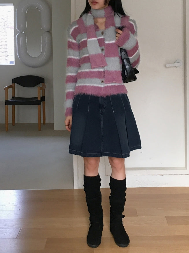 [Muffler Set] Jes Fur Stripe Color Matching Collar Knit Long Sleeve Cardigan