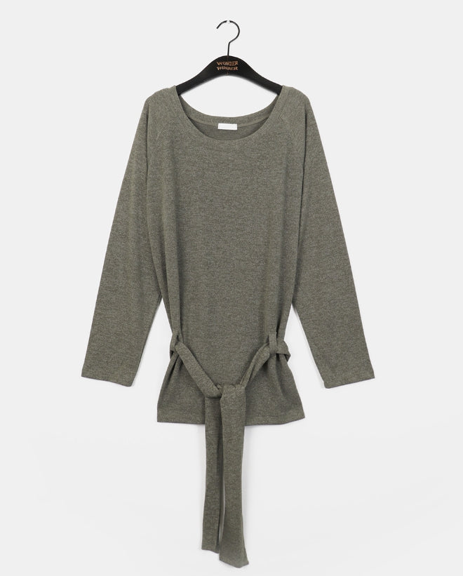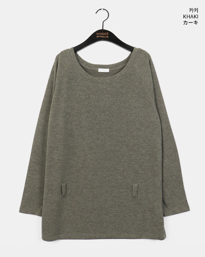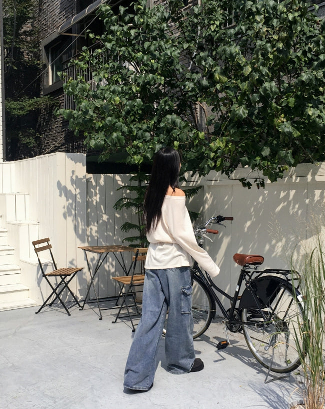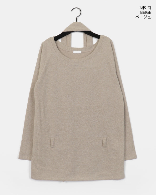[Muffler set] Liton strap boat neck off shoulder long knit T-shirt
