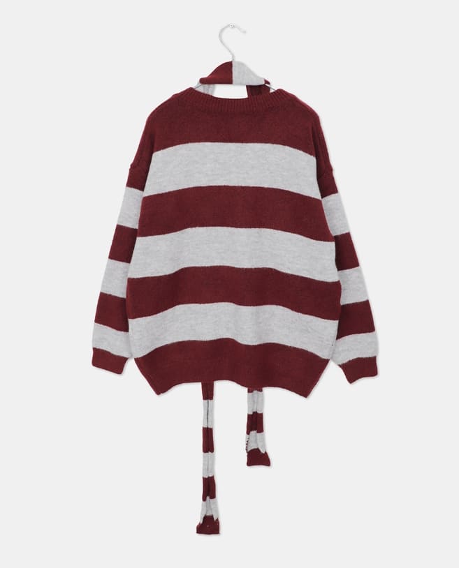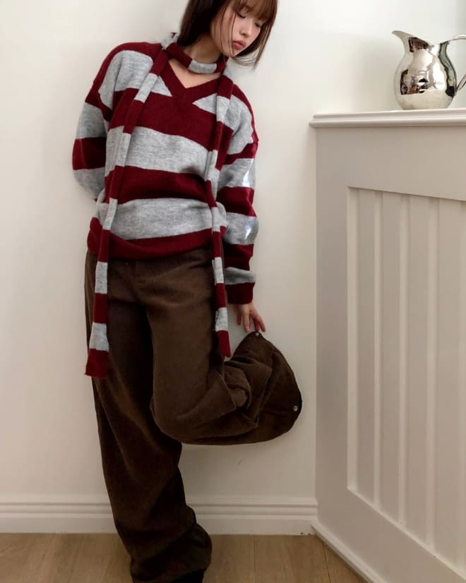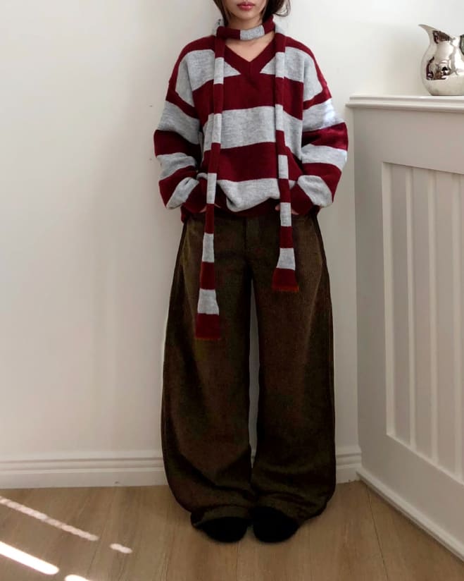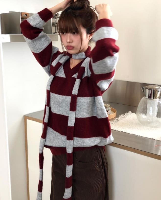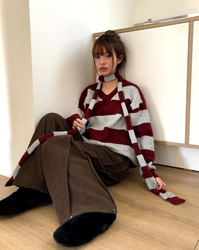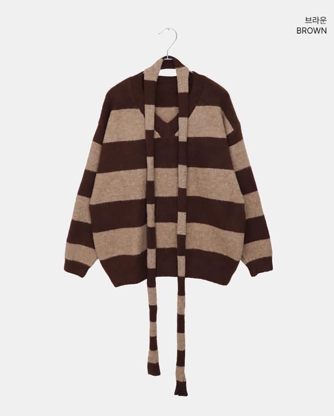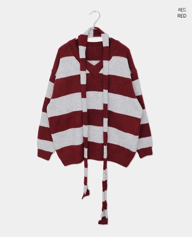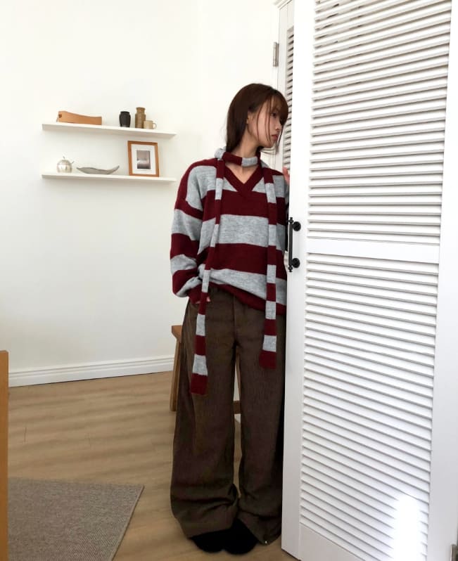 [Muffler SET] Phu Stripe Color Matching V-Neck Loose Fit Long Sleeve Long Knit
