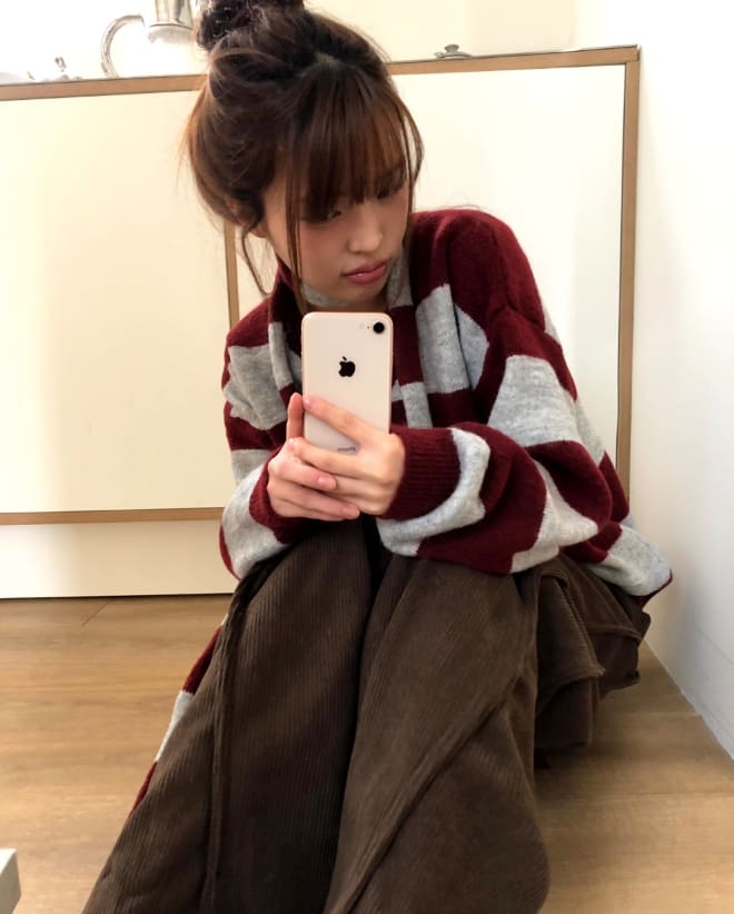 [マフラーセット]プフボーダーカラーVネックルーズフィット長袖ロングニット