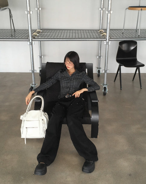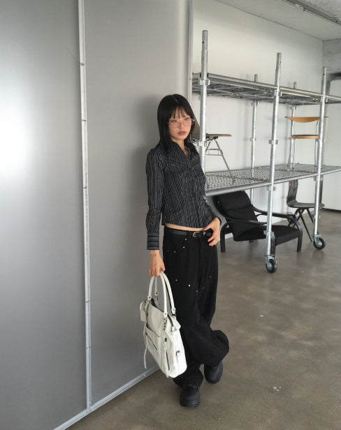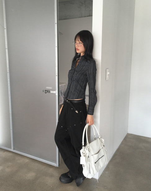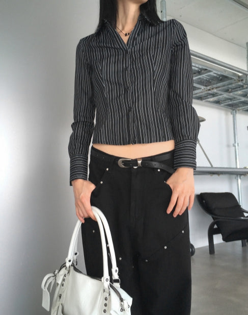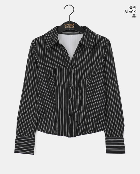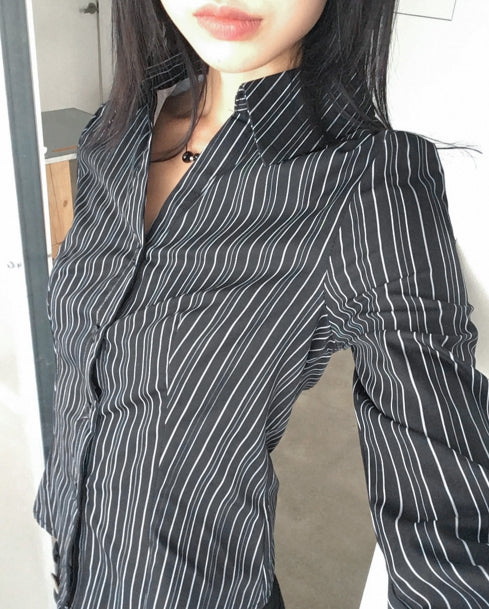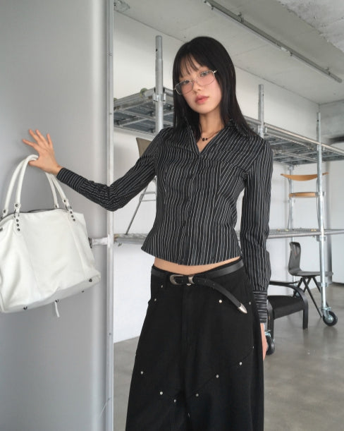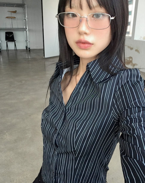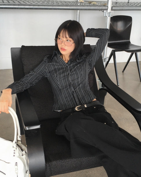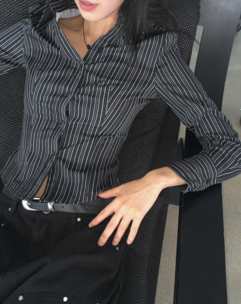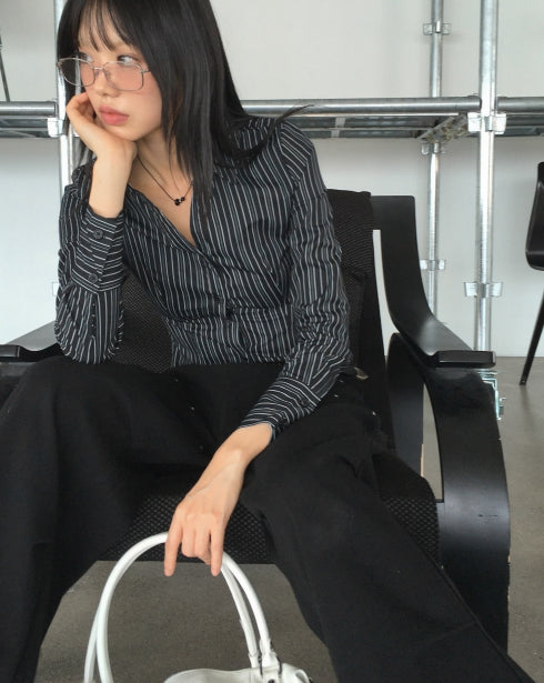 NIVEN Slim Fit V-Neck Semi-Crop Stripped Shirt