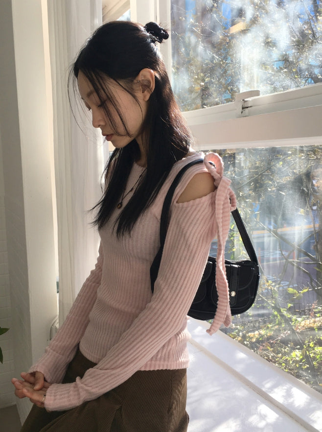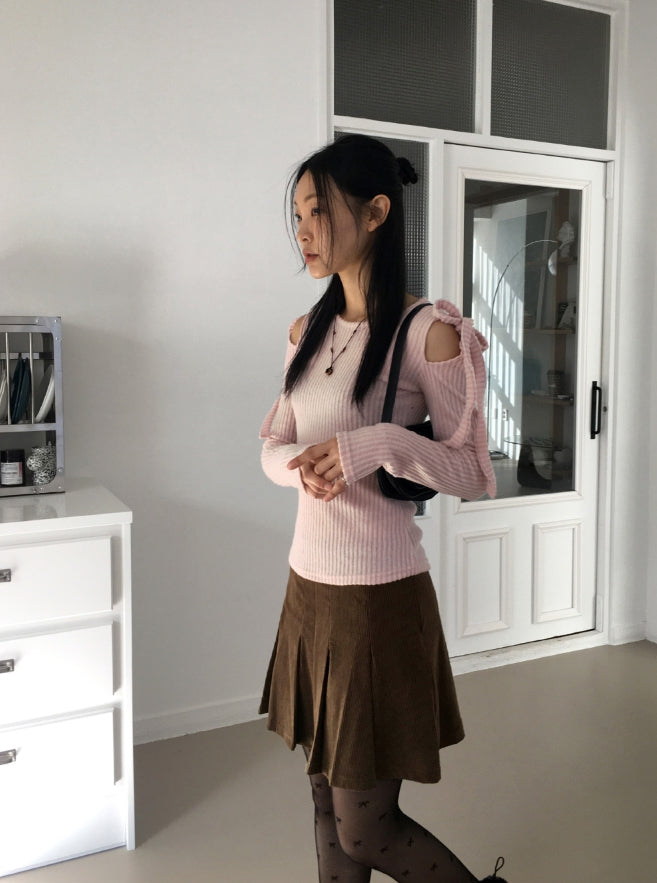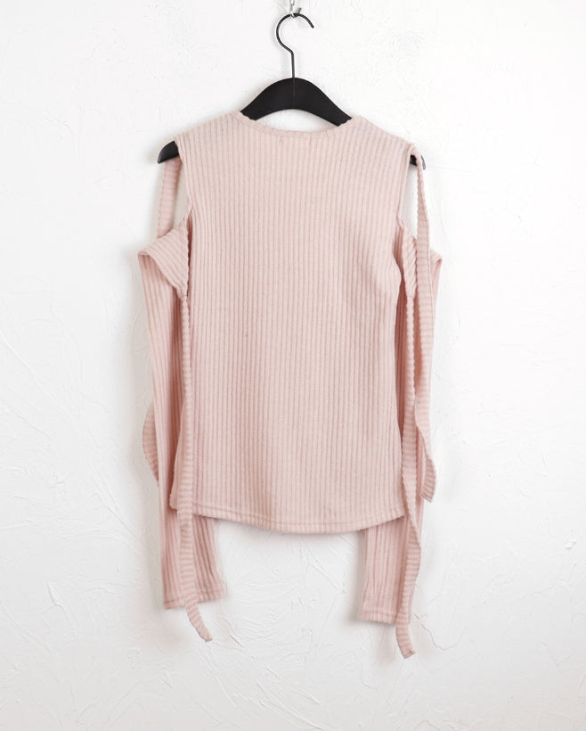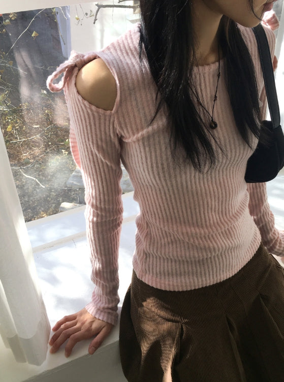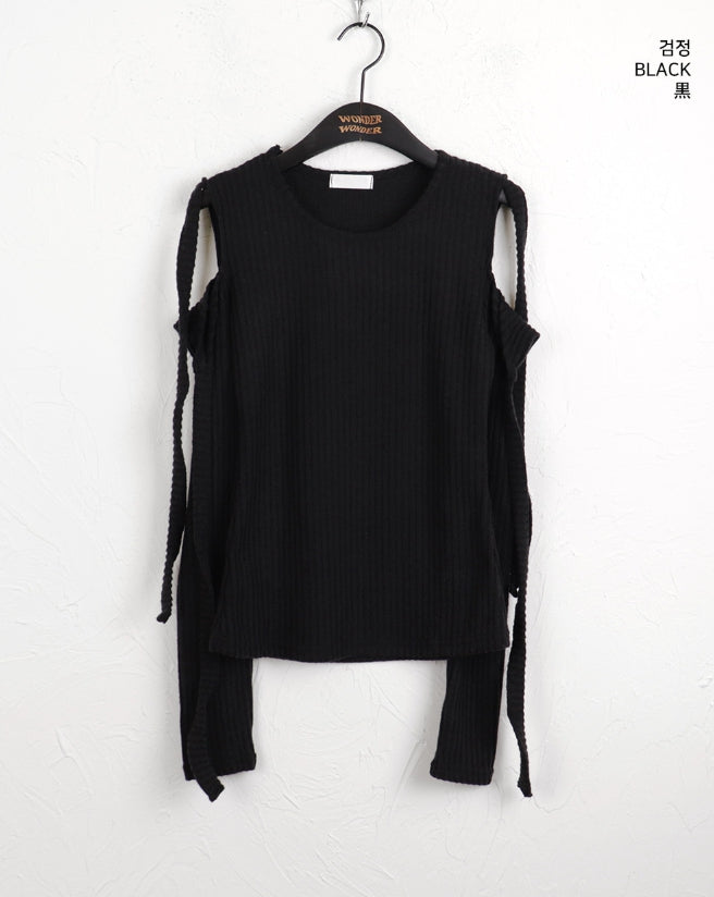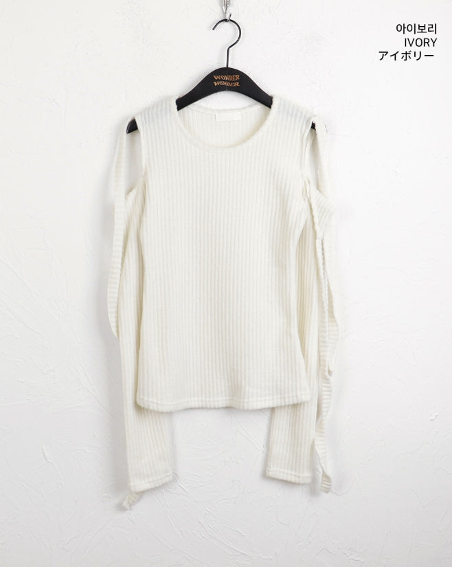 Nond Ribbon Slit Ribbed Brushed Long Sleeve T-shirt