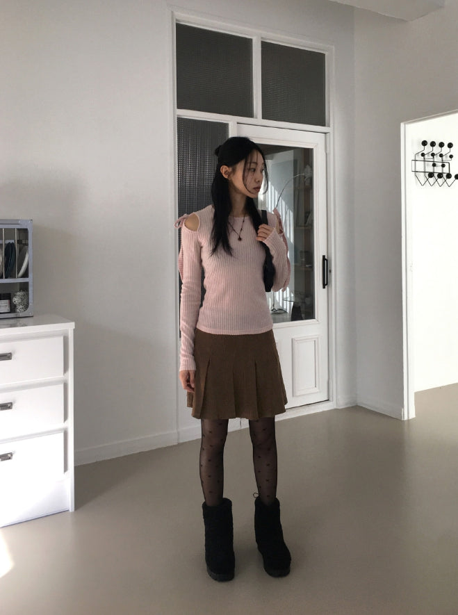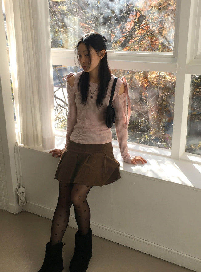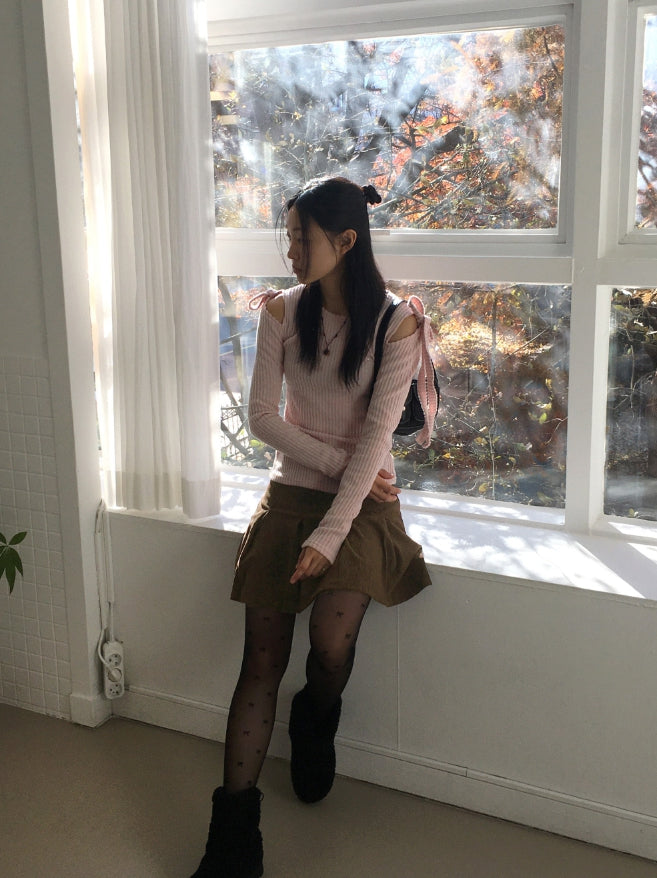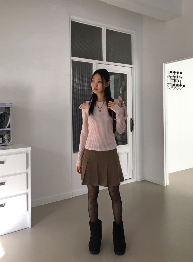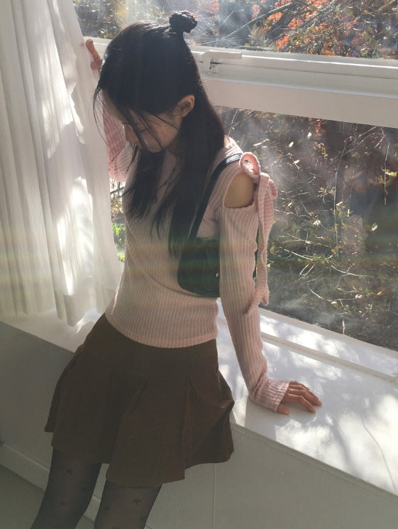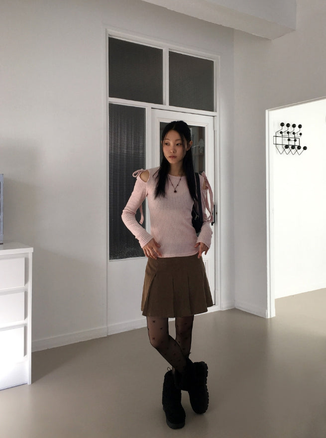 Nond Ribbon Slit Ribbed Brushed Long Sleeve T-shirt