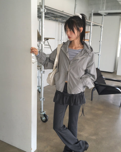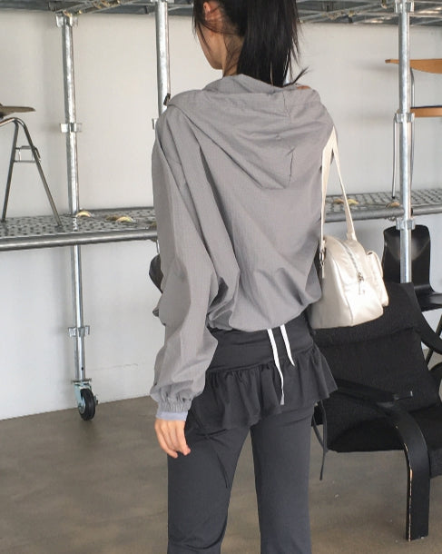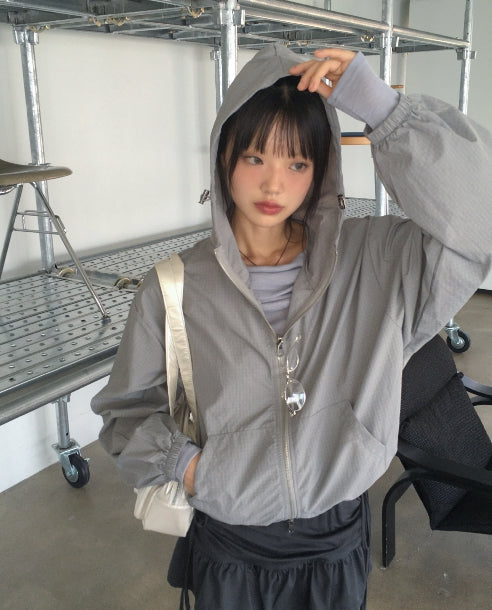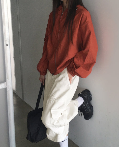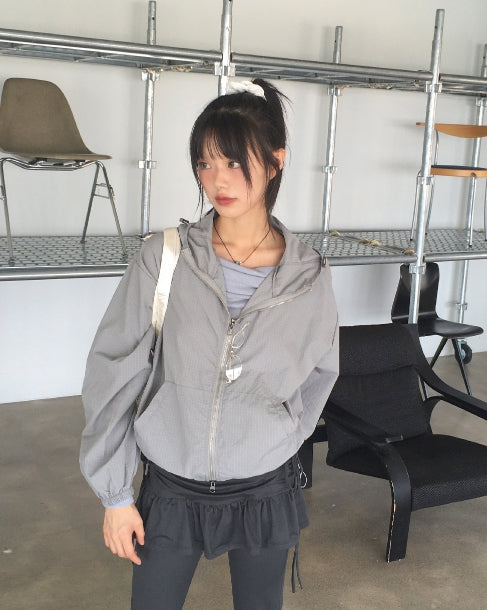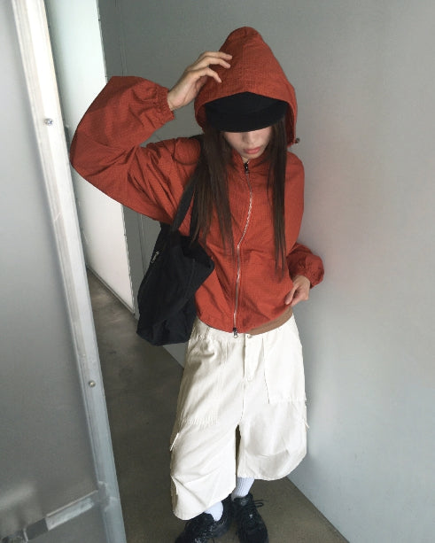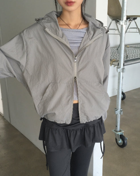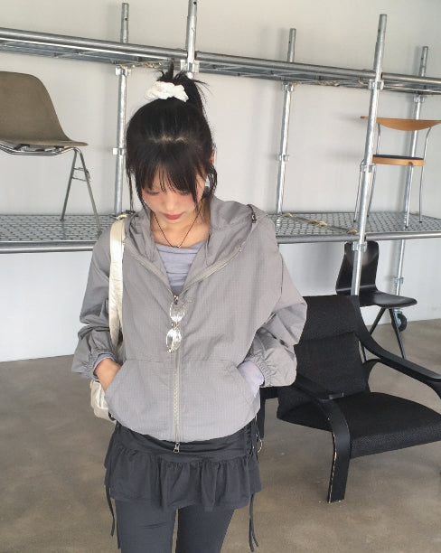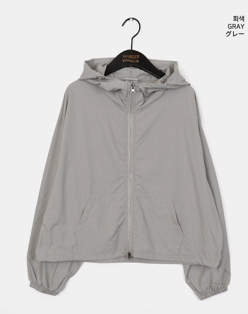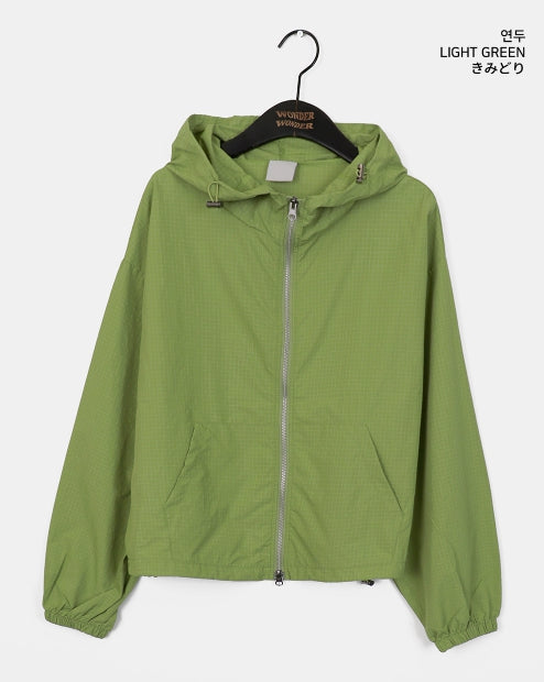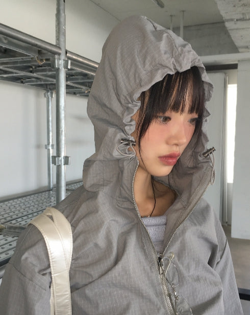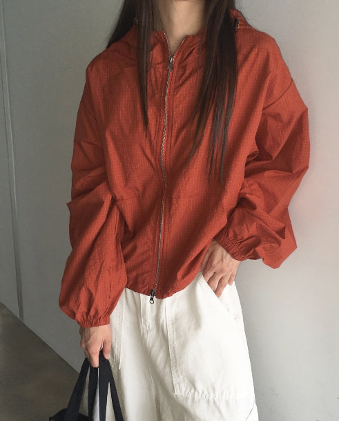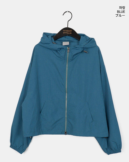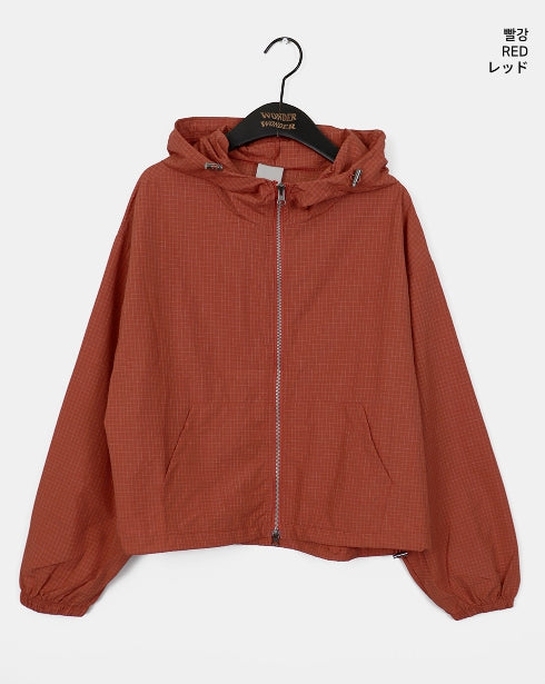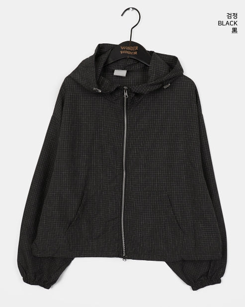 Ponel Grid Check Windbreaker Nylon Two-Way Hood Zip-Up