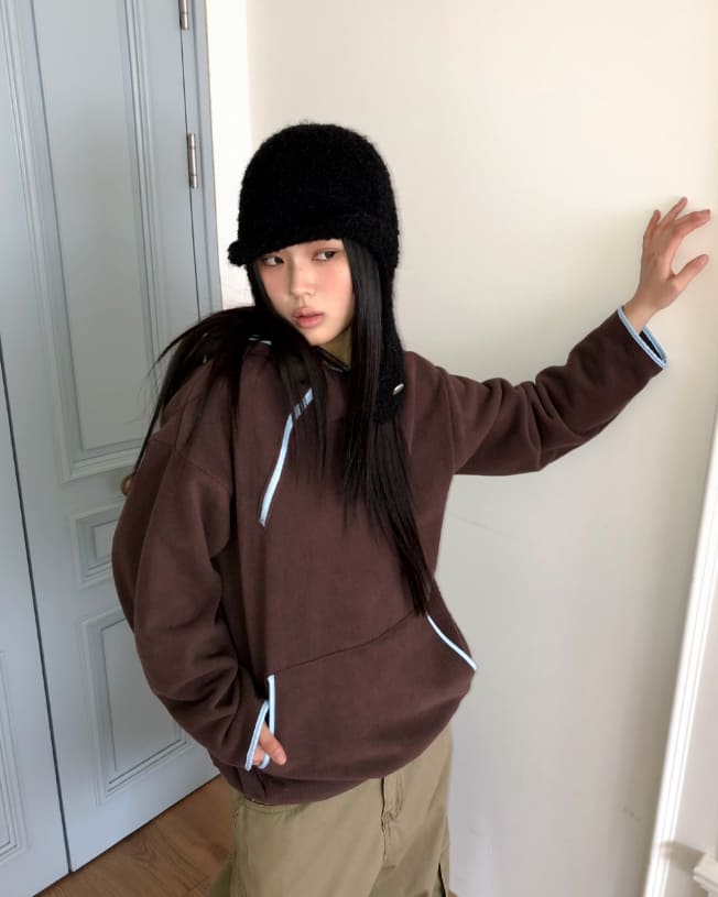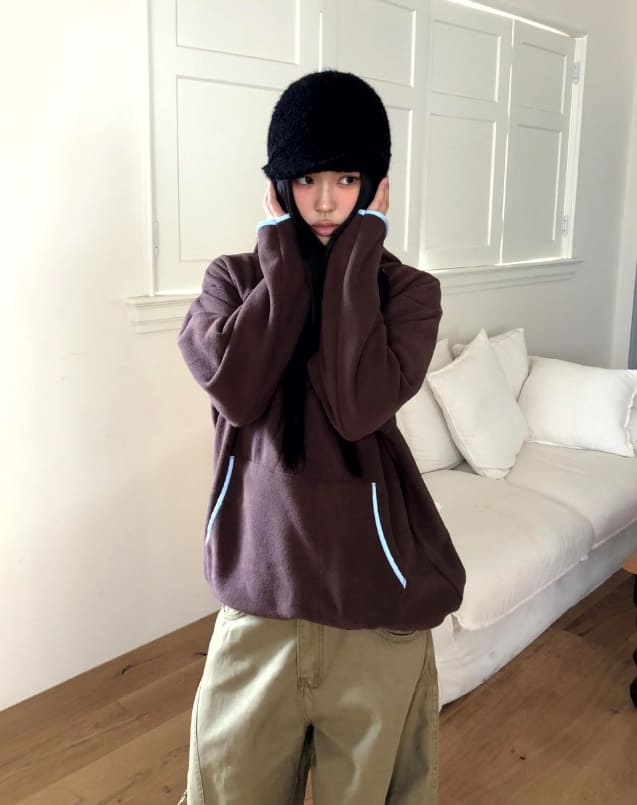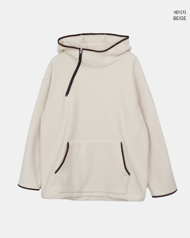 Ponnan Color Matching Diagonal Half Zip-Up Brushed Hood T-Shirt