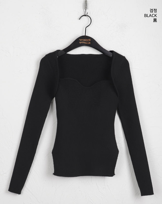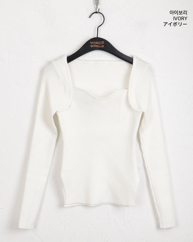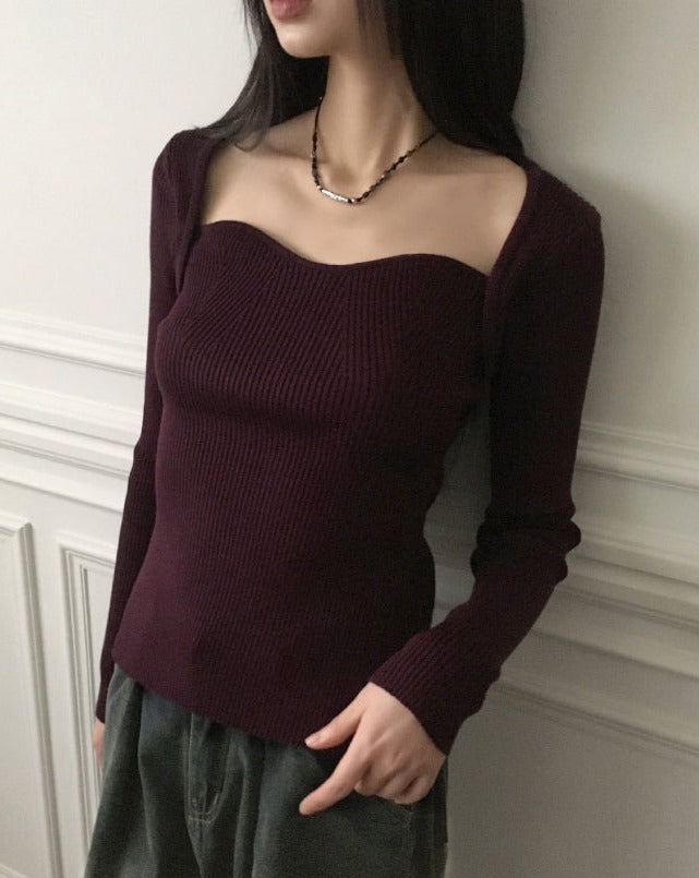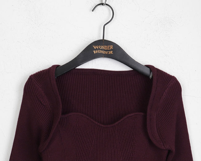 RB Bolero Slit Ribbed Wave Square Heart Neck Long Sleeve Knit
