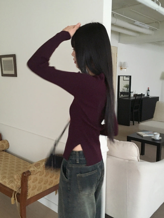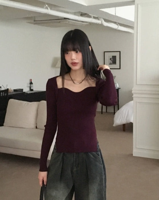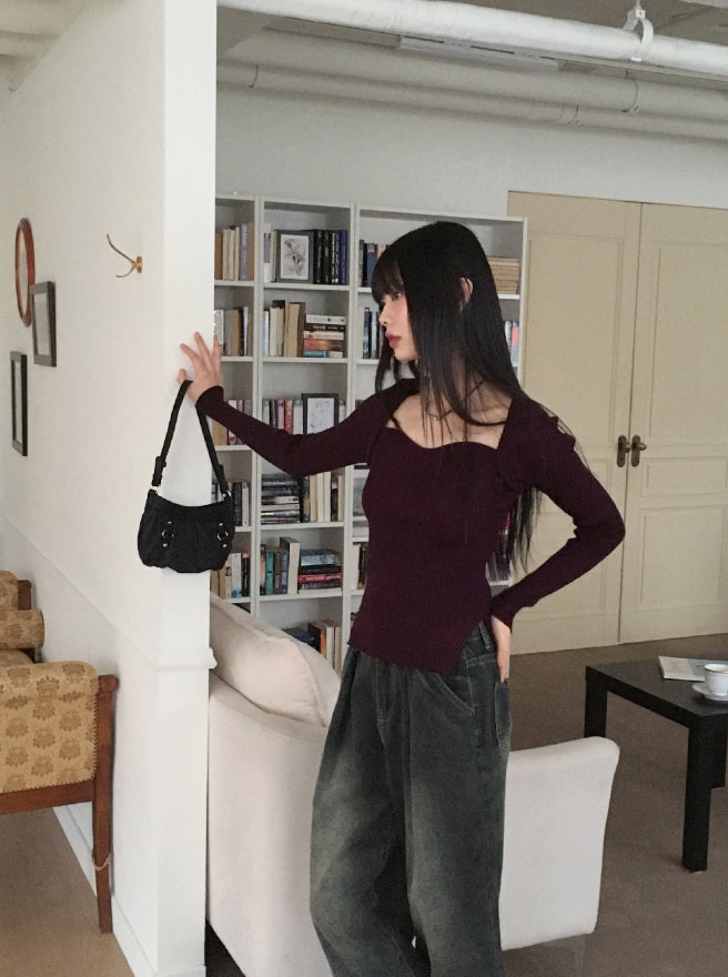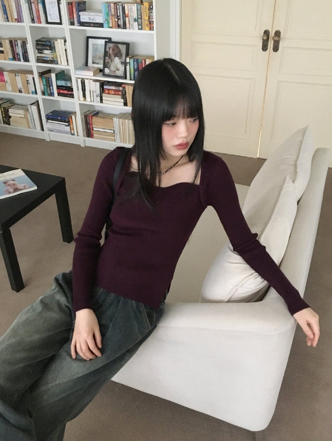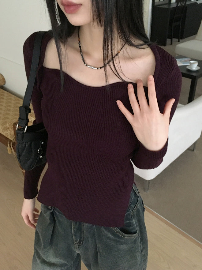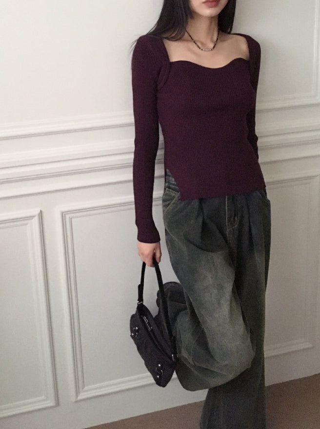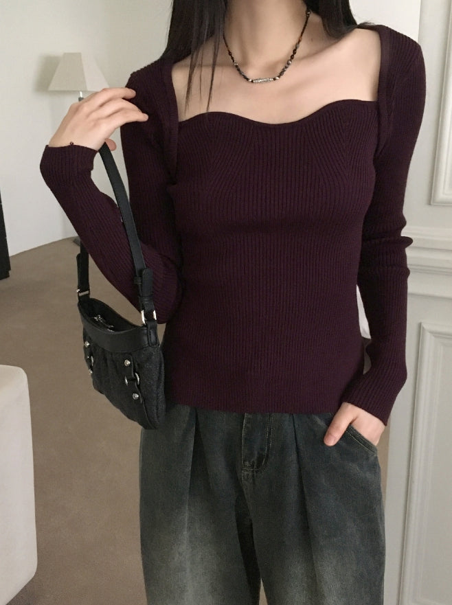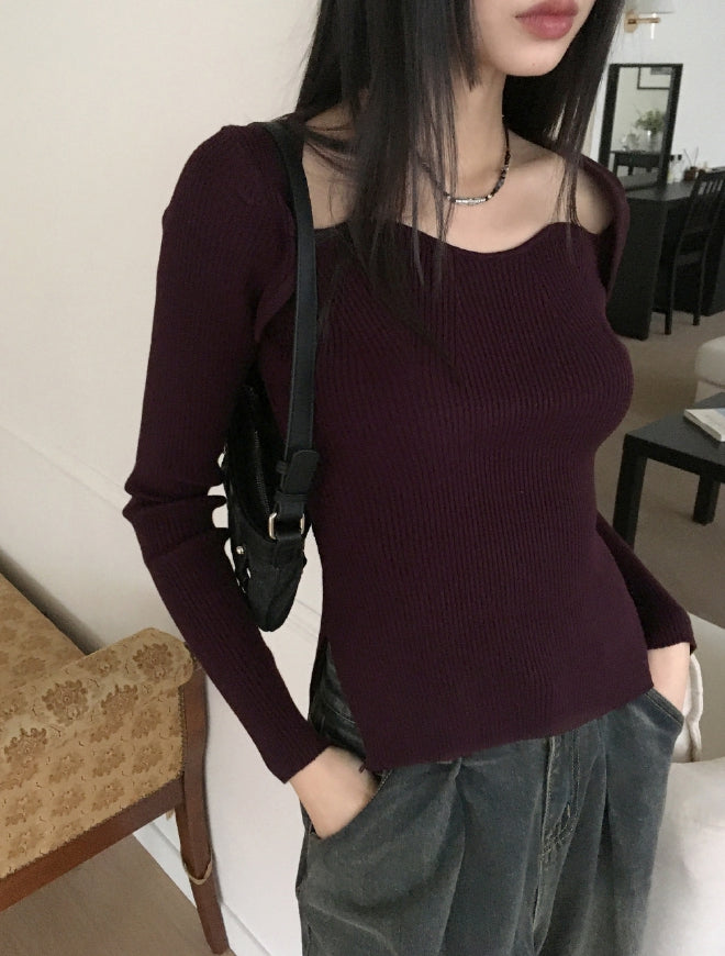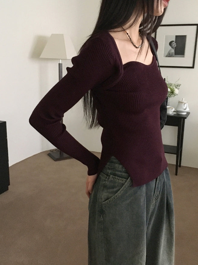RB Bolero Slit V-Neck Wave Square Heart Neck Long-Sleeved Knitwear