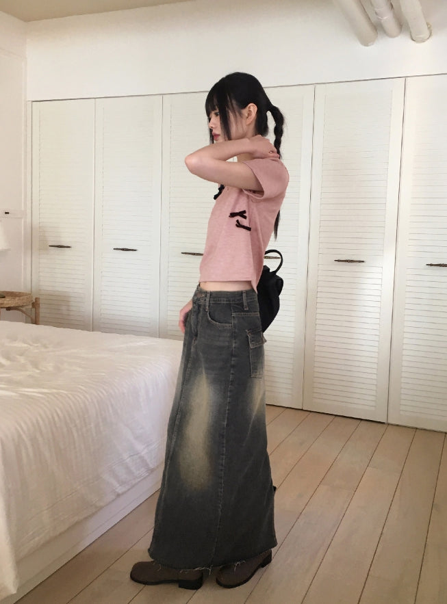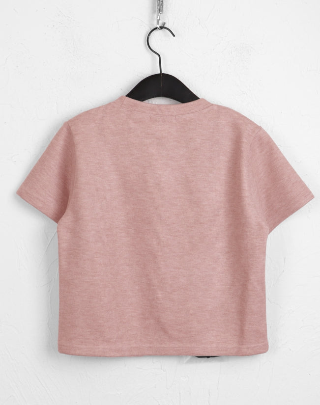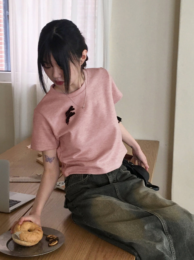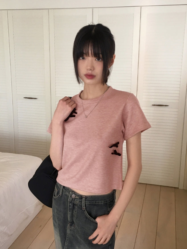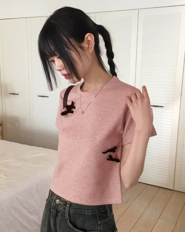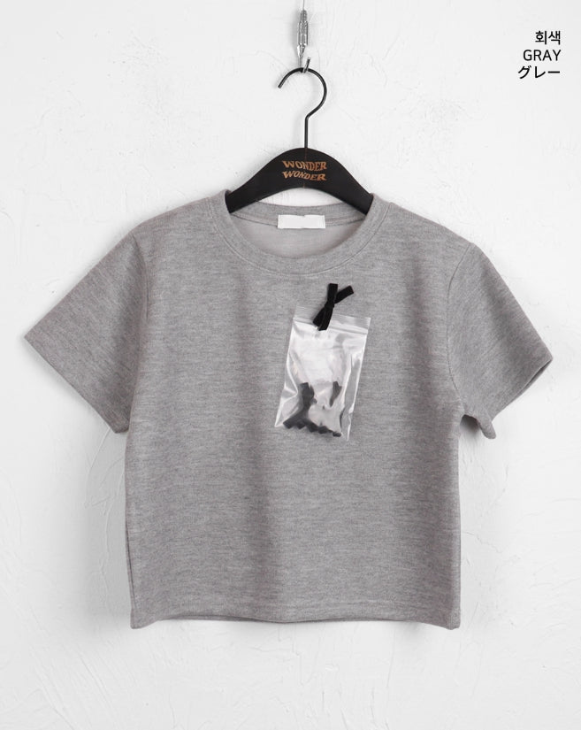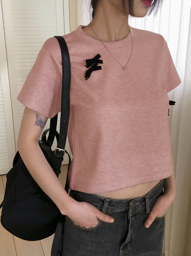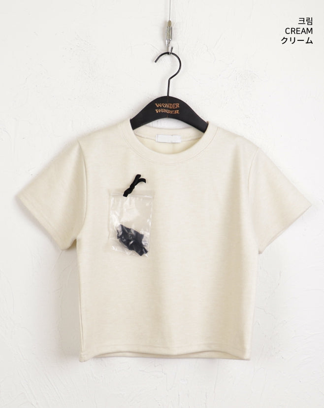 [Ribbon pin] Luce Velvet Ribbon Terry Cropped Short Sleeve T-shirt
