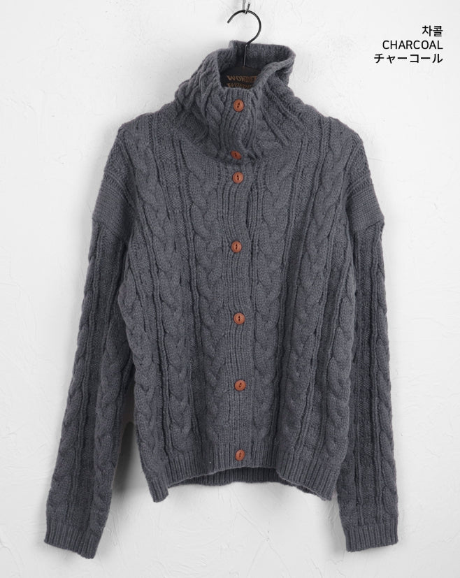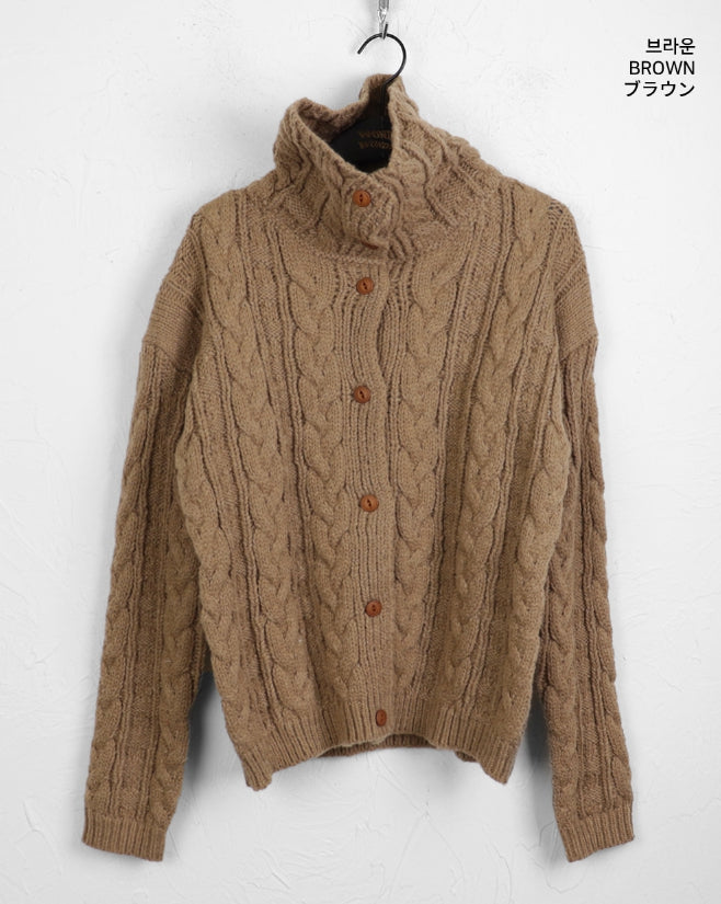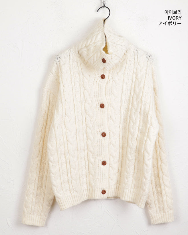 ロベカラーハイネックアバンケーブルニット長袖カーディガン