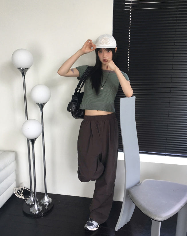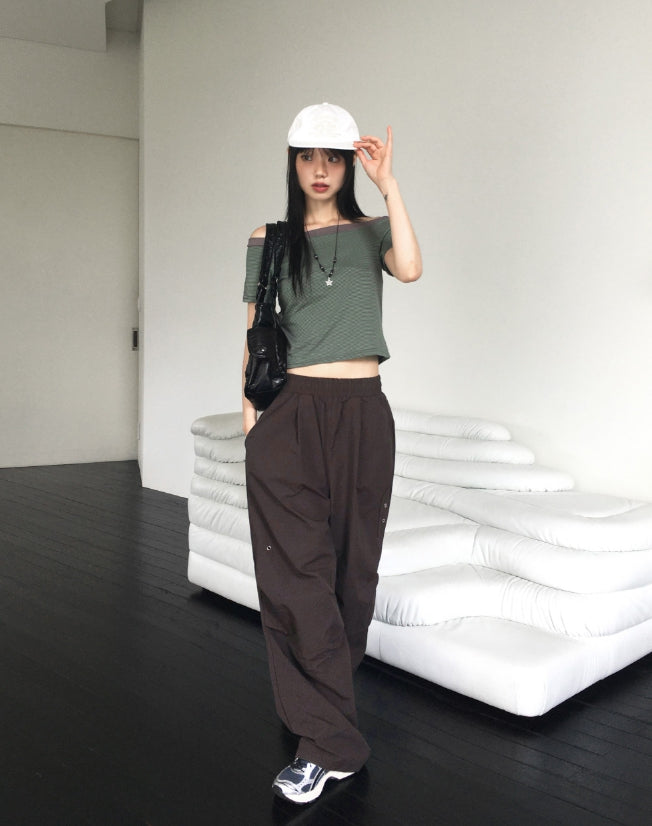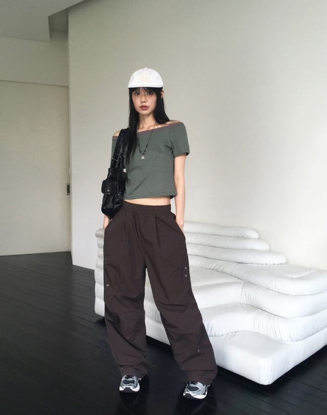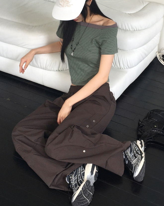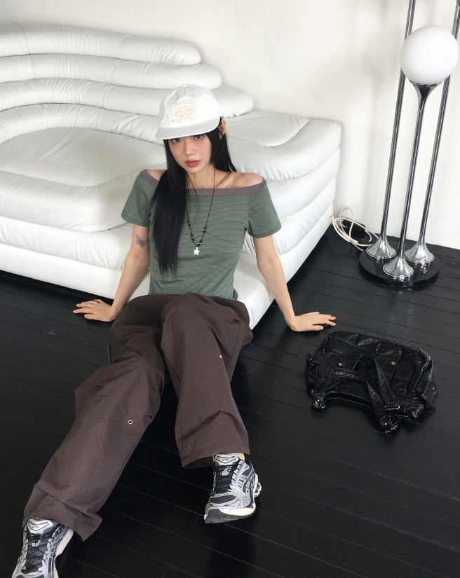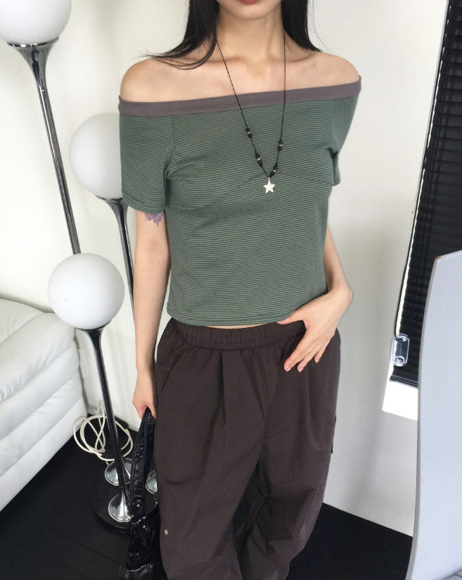 Rutot Stripe Color Matching Off-Shoulder Short-Sleeved T-Shirt